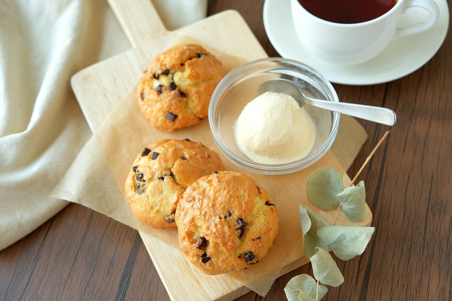 クックハウスのチョコスコーンは、小さめのチョコチップがたっぷり入ったしっとり食感が特徴です。大き目の器にチョコスコーンを崩してアイスをトッピングして食べると、手軽にまるでクッキークリームアイスのようなスイーツを楽しむことができます。チョコスコーンを少しだけトースターで温めて、アイスを乗せながら食べるのもおすすめです。