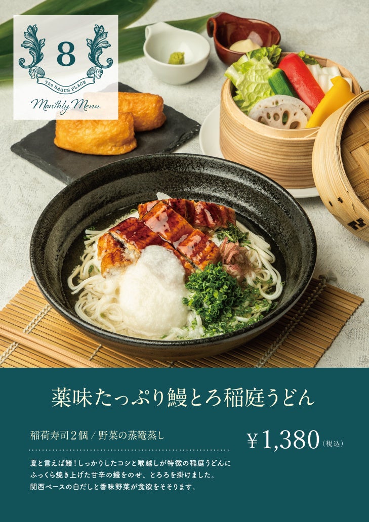 バグースプレイスの8月限定ランチに、夏のスタミナ食「鰻」を使ったさっぱり冷やしうどんが登場。しっかりしたコシとのど越しが特徴の稲庭うどんに、ふっくら焼き上げた甘辛の鰻をのせ、関西ベースの白だしをかけていただきます。夏の猛暑で食欲が落ちる時期にぴったりな一品です。たっぷりのとろろと香味野菜と一緒にお召上がりください。セットには稲荷ずしと野菜の蒸篭蒸しをご用意しております。銀座で清涼感たっぷりの8月限定ランチをぜひお楽しみください。