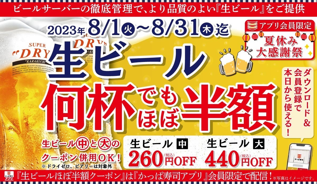 かっぱ寿司では「生ビールほぼ半額キャンペーン」を定期的に期間限定で開催しており、かっぱ寿司のお得なキャンペーンとしてお客様より大変ご好評をいただいております。8月は『夏休み大感謝祭』として1ヵ月間実施いたします。寿司やラーメン・茶碗蒸しなどのサイドメニューと一緒に、温度・品質が徹底管理されたビールサーバーにて提供する生ビールをお得にご堪能ください。