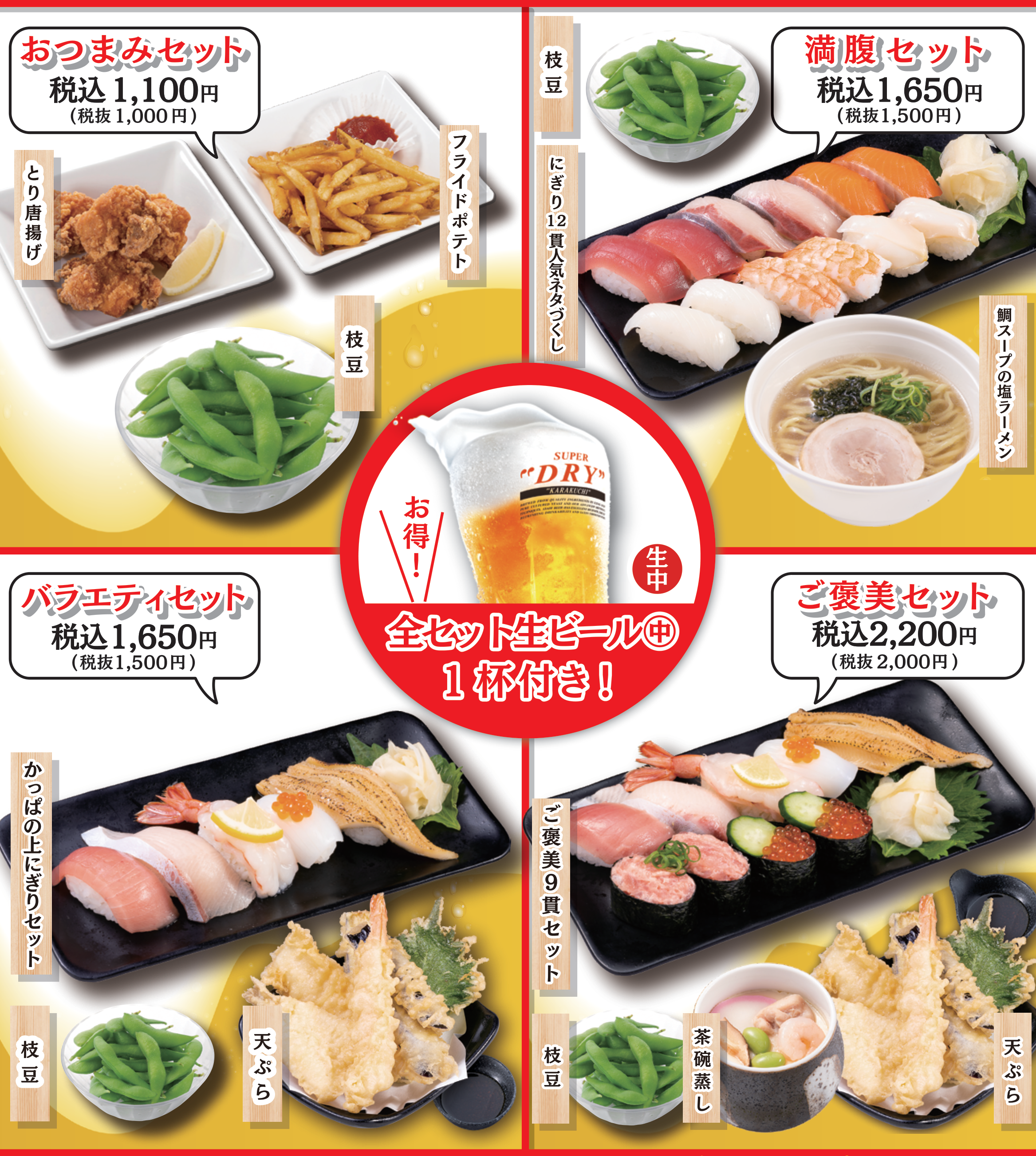 ※「お得にかっぱ飲み」4セット商品内の生ビール(中)は、かっぱ寿司アプリ会員限定「生ビールほぼ半額クーポン」対象外です。