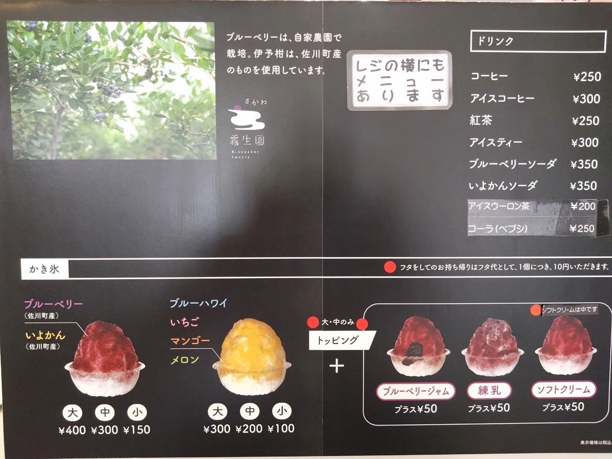 霧生園では自家製のブルーベリーを使ったジャムやお菓子、ソフトクリームなどを販売しております。佐川町の地乳「ぢちち」を使ったソフトクリームは店内のイートインスペースで食べることができます。お薦めは、さかわかき氷街道2023にエントリー中の絶品、佐川町産のブルーベリーと伊予柑果汁を使用したかき氷です。