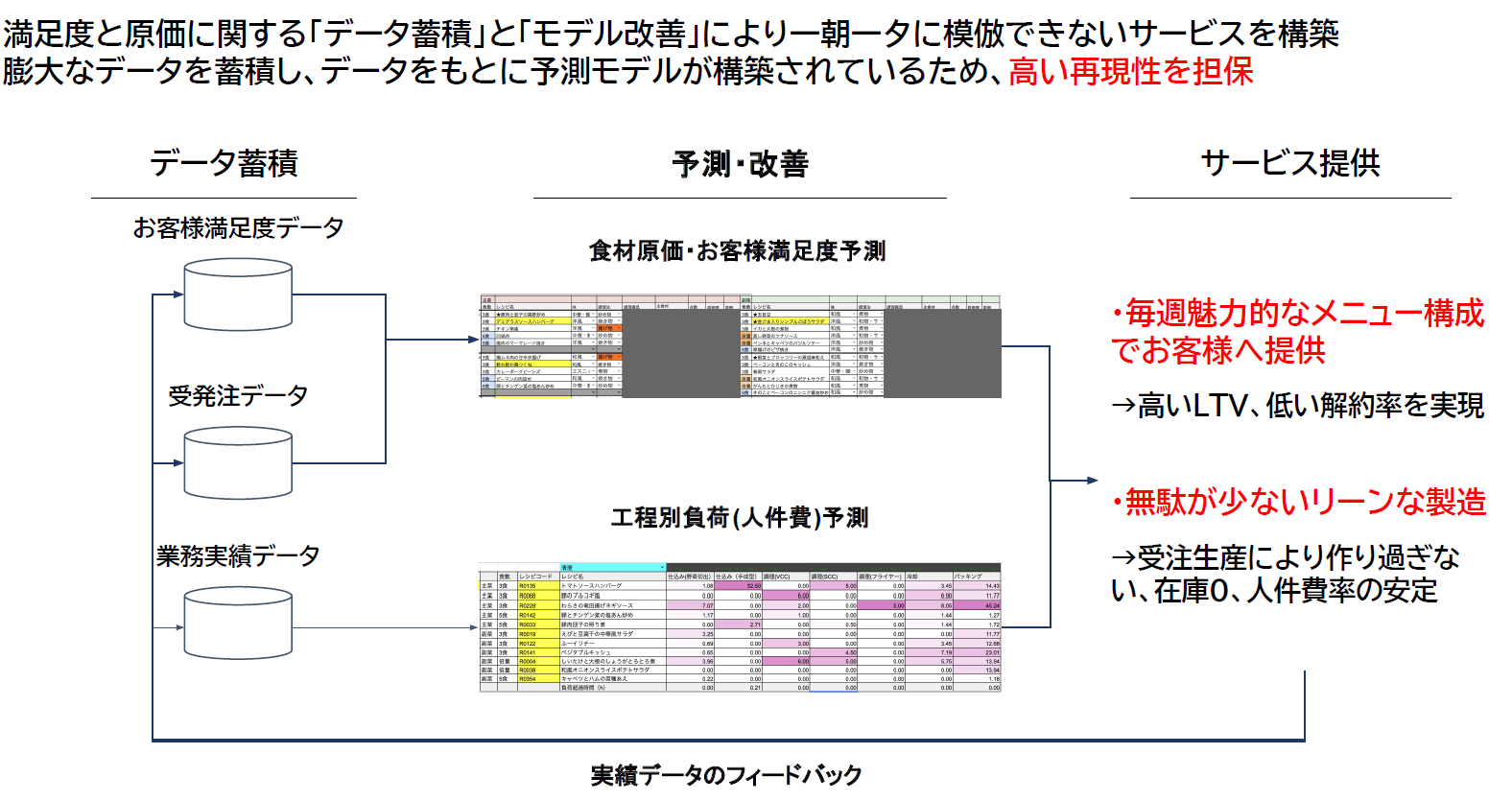 お客様の満足度データや受発注データ、業務の実績データをもとにどのようなメニュー構成であればお客様の満足度が担保できるのか、現場負荷が定量的に許容できる水準なのか予測を行います。実際にお客様へ商品を提供し、予測と実績を照らし合わせて改善のサイクルを回すことで、再現性の担保と一朝一夕には真似ができない模倣困難性を実現しています。