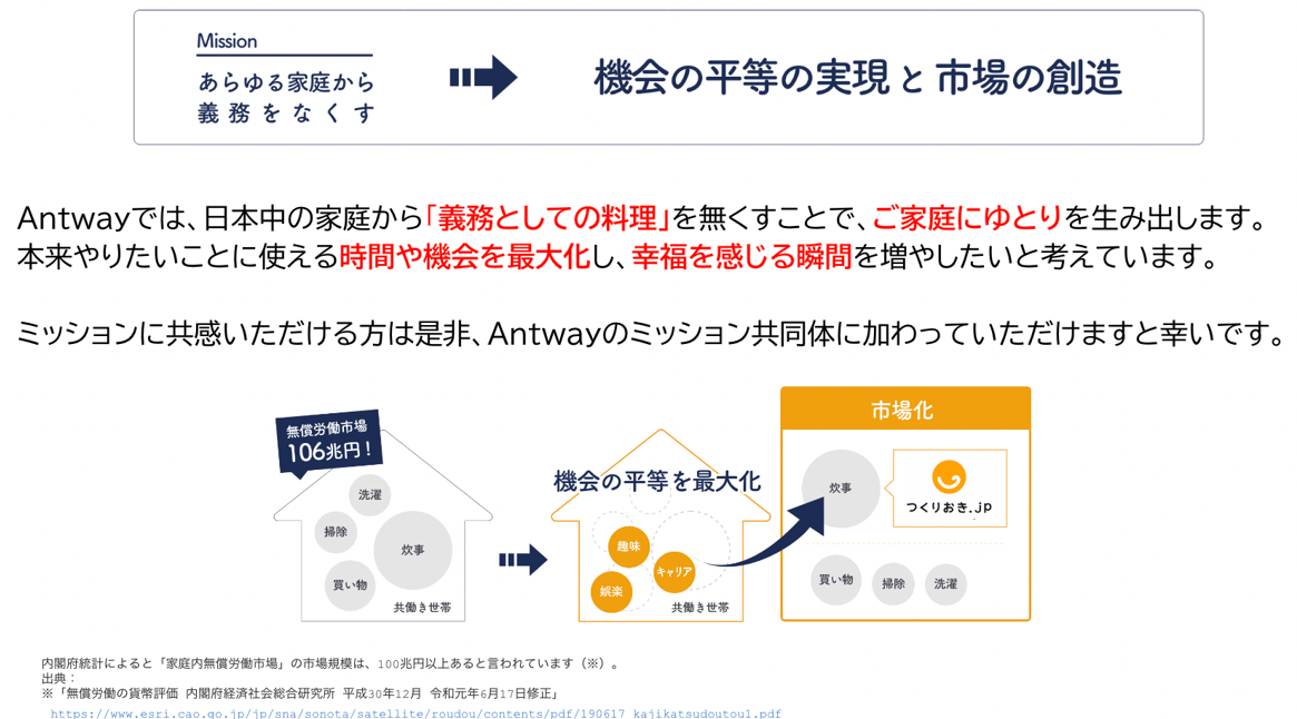 株式会社Antwayは、「あらゆる家庭から義務をなくす」をミッションに掲げ、現在家庭料理の宅配サービス「 つくりおき.jp 」を提供しています。家族との時間、活躍できるキャリア、趣味や社交で充実した余暇などの様々な機会に対して、誰もが前向きに取り組める世界を、「あらゆる家庭から義務をなくす」ことで実現していきます。