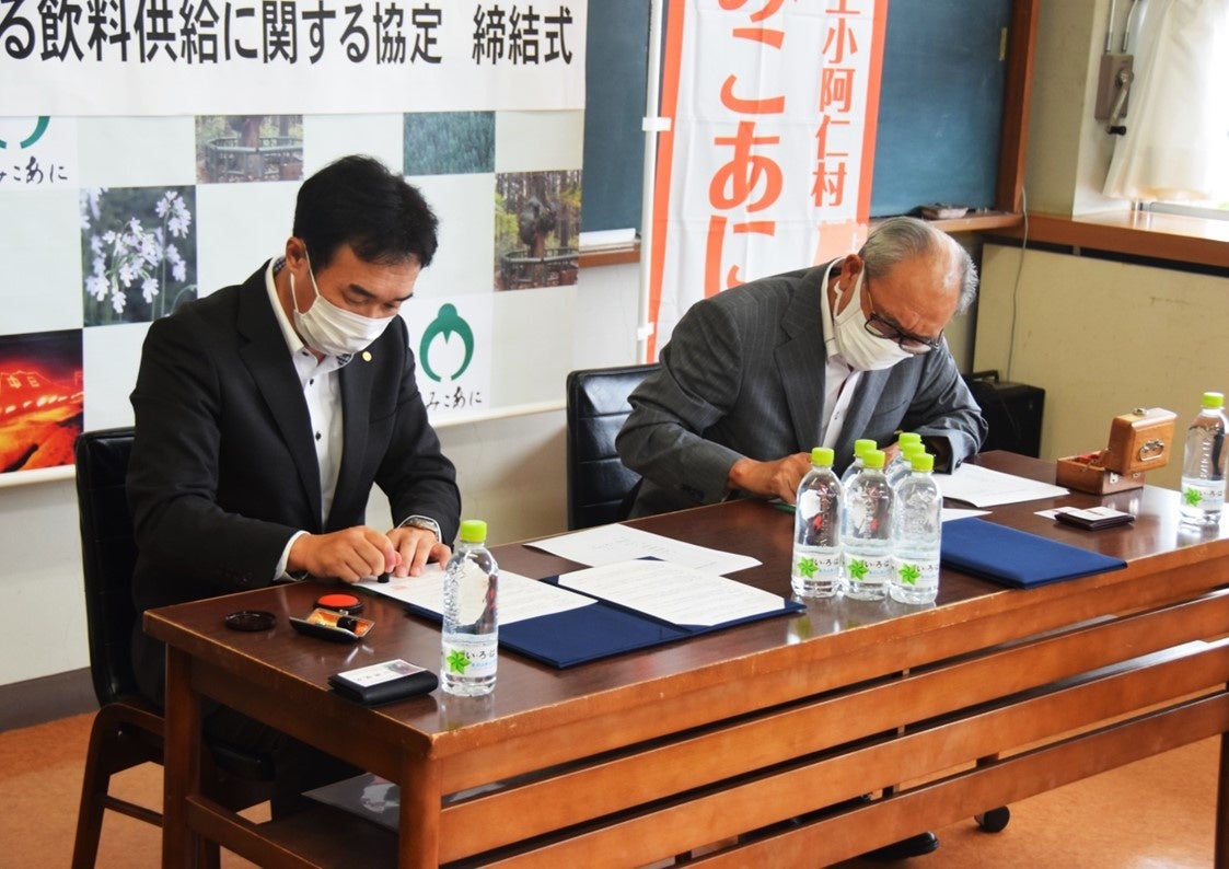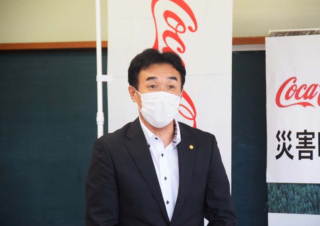 「本村では、15日からの大雨により甚大な被害を受けました。どの自治体でも同様のこととは存じますが、住民全員の飲料水を備蓄するということは現実的には難しく、周辺の市町村と助け合うことが前提となっております。そのような中、今回の協定により、災害時に被害の発生している場所へ迅速に飲料水を配送いただけるようになることは大変心強く、村民を代表しまして御礼申し上げます。」