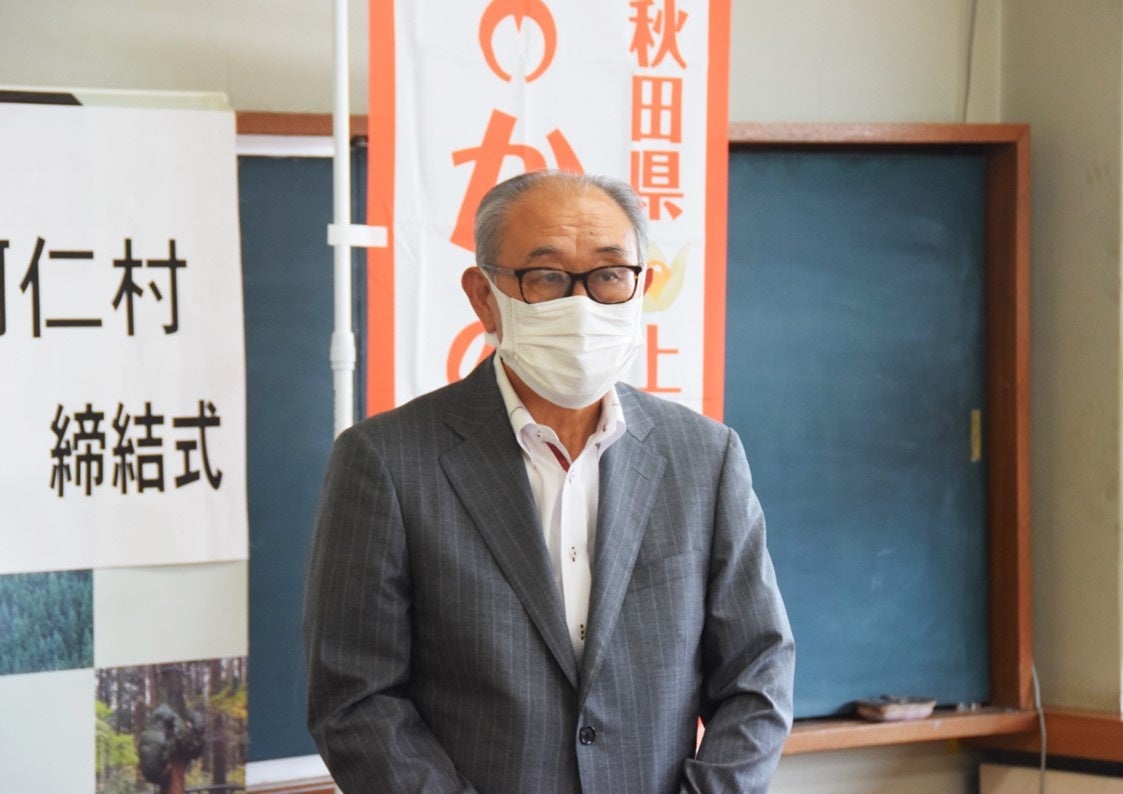 【出席者】<上小阿仁村> 村長 小林 悦次 様、副村長 海老原 史 様、住民福祉課長 斎藤 幹雄 様、<当社> 秋田営業部 秋田営業部長 佐藤 茂正、秋田営業部 秋北支店長 髙野 紀世彦
