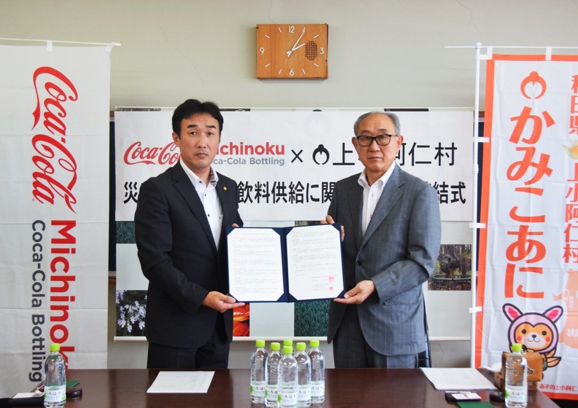 この協定は、上小阿仁村における地震、風水害等の災害発生時又は発生のおそれがある場合における飲料の供給について必要な事項を定めています。同様の協定締結は当社事業エリア(岩手県・秋田県・青森県)では102件目、秋田県では27件目(※)となります。なお、このたびの締結により、当社は秋田県内の全25市町村と本協定を締結いたしました。今後も引き続き、いつどこで起こるか分からない災害に対し、県や近隣の市町村を通じて助け合える体制をより一層構築してまいります。