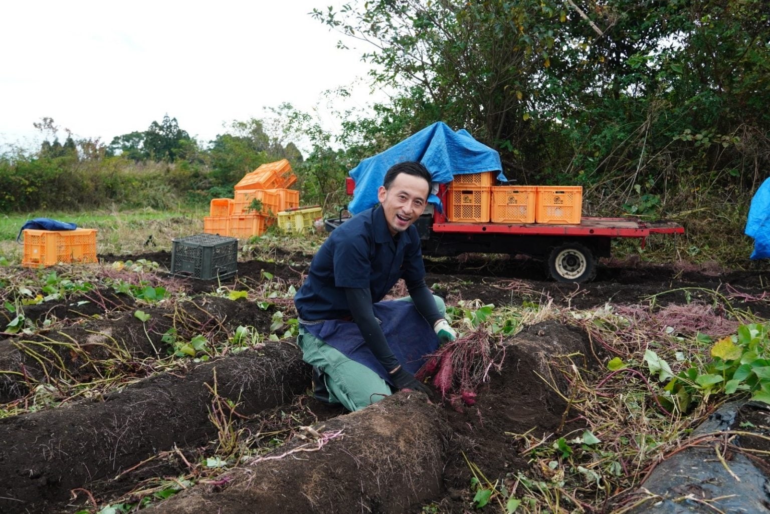 新富町で生まれ育ち、祖父、父と続く実家の畑を引き継ぎサツマイモ生産を行う事業者「GOOD PEOPLES」の代表・藤井さんは、元デザイナーという新富町の農家の中でも珍しい経歴。新富町のサツマイモに可能性を感じ、海外進出も視野に入れて日々生産しています。