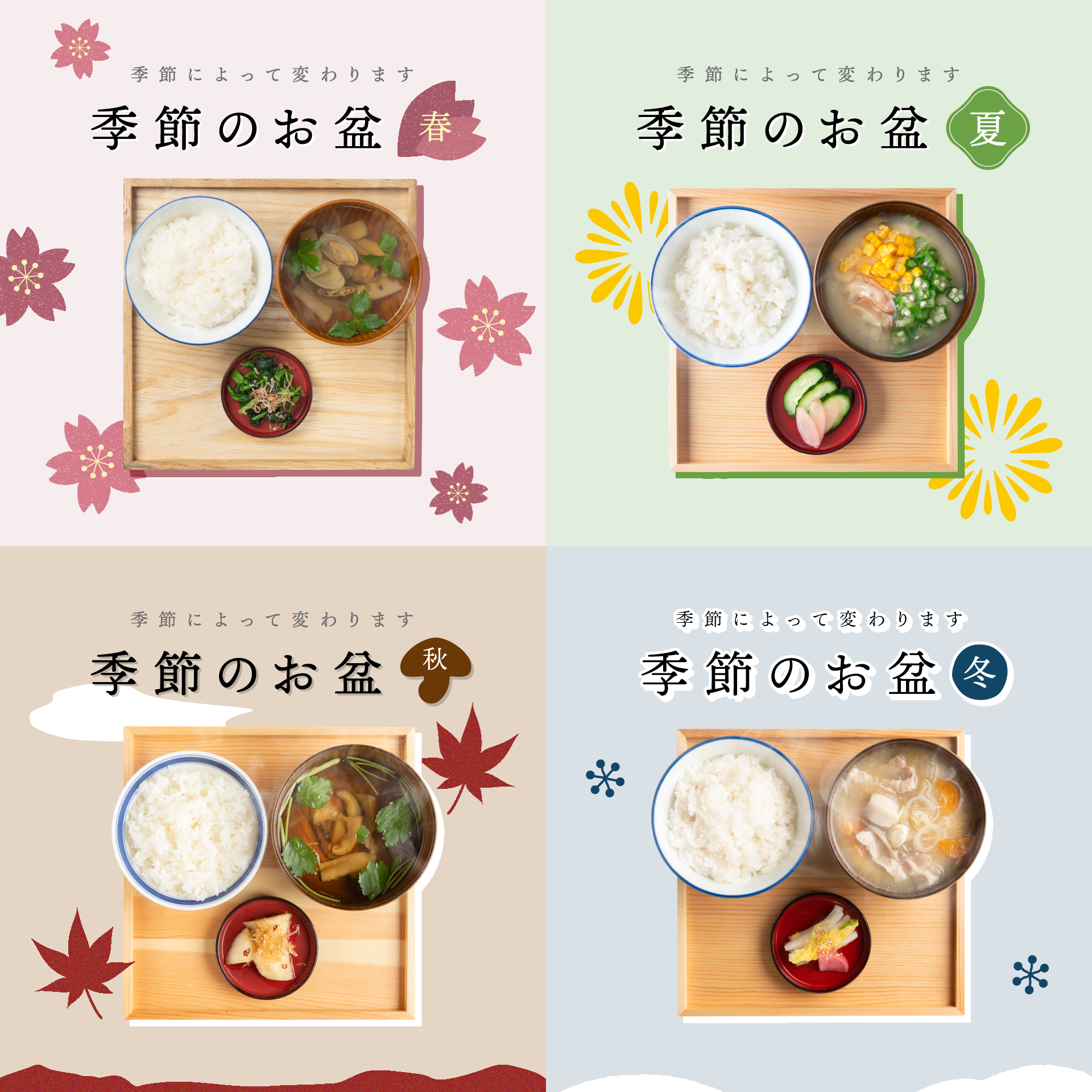 無形文化遺産に登録された和食文化の特徴の一つに「自然の美しさや季節の移ろいの表現」という、四季豊かな日本ならではの定義があります(出典:農林水産省HP)。定食といえばついついおかずに注目しがちですが、四季の移ろいを表現するために私たちが注目したのは「ごはん・汁物・漬け物」。季節ごとに変化を加え、旬の食材を使用した一食をご提供致します。