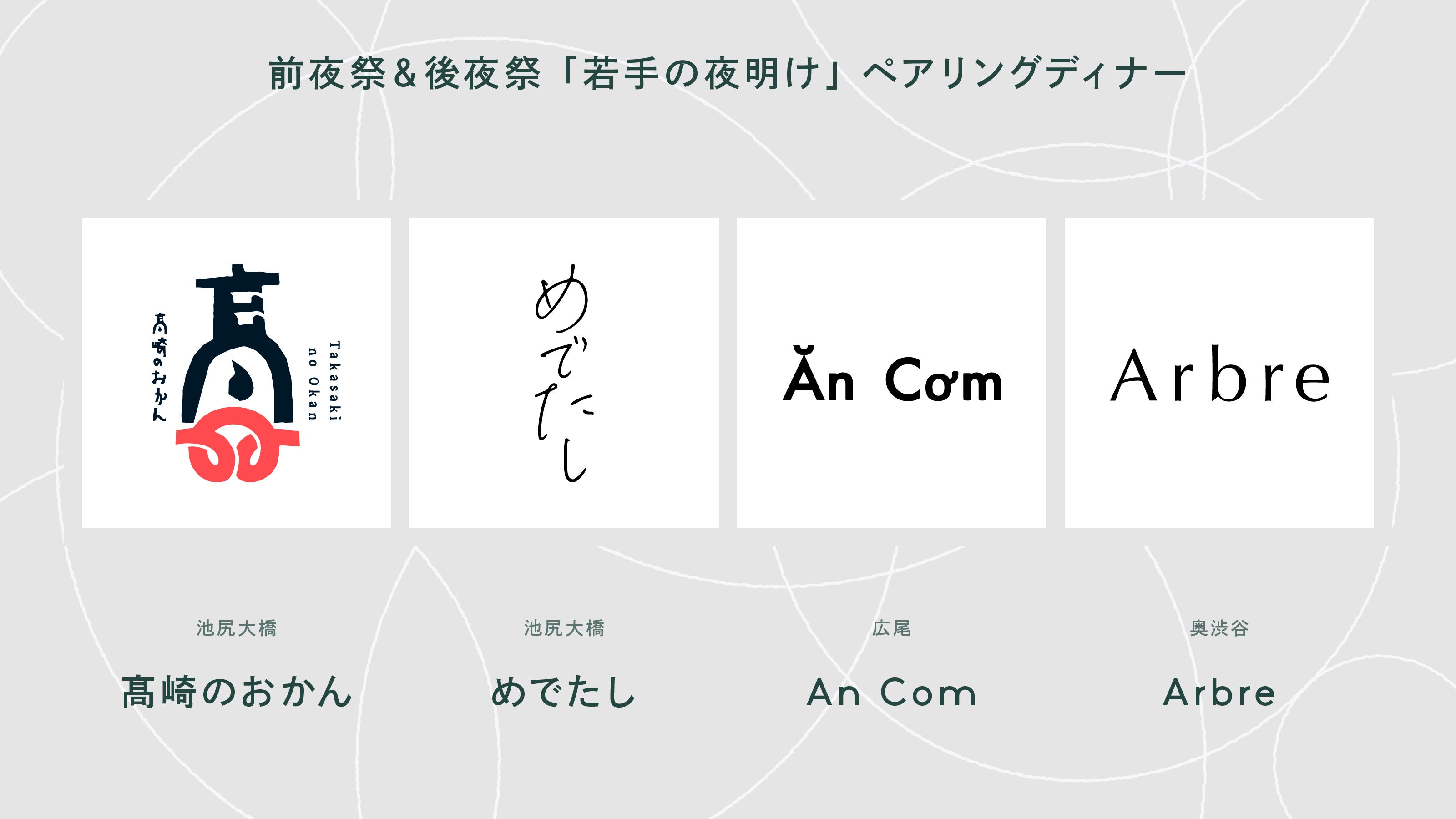 イベント前の9月11日(月)〜12日(火)、そして直後の17日(日)〜18日(月)に前夜祭、後夜祭として、『若手の夜明け2023 AUTUMN』参加蔵のお酒との特別なペアリングディナーを開催します。会場となるのは「髙崎のおかん」「Arbre」「めでたし」「An Com」の日本酒と料理のペアリングが人気の名店4店舗。貴重なこの機会にぜひご参加ください。