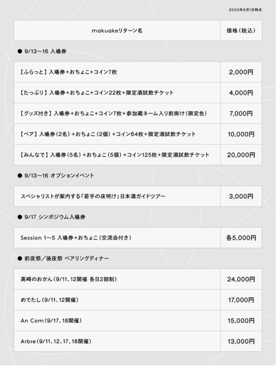 日本酒市場を牽引する気鋭の若手醸造家や家業を継いで間もない発展途上の蔵、はたまた業界大手として若手人材の育成を担うメーカー、そして”クラフトサケ”と呼ばれる新しいカテゴリーを発信する前衛的な酒蔵まで、これからの日本酒業界を担う若手醸造家たちが集う『若手の夜明け2023 AUTUMN』。今回の開催には全国28都道府県から46蔵が集い、各日毎に各酒蔵が2〜3種類のお酒の試飲提供を行います。この入場・試飲に必要な入場券と本イベントに付随する日本酒ガイドツアーやセミナー、特別企画であるペアリングディナーなどへの申込受付をクラウドファンディングサービス「Makuake」限定で開始いたしました。