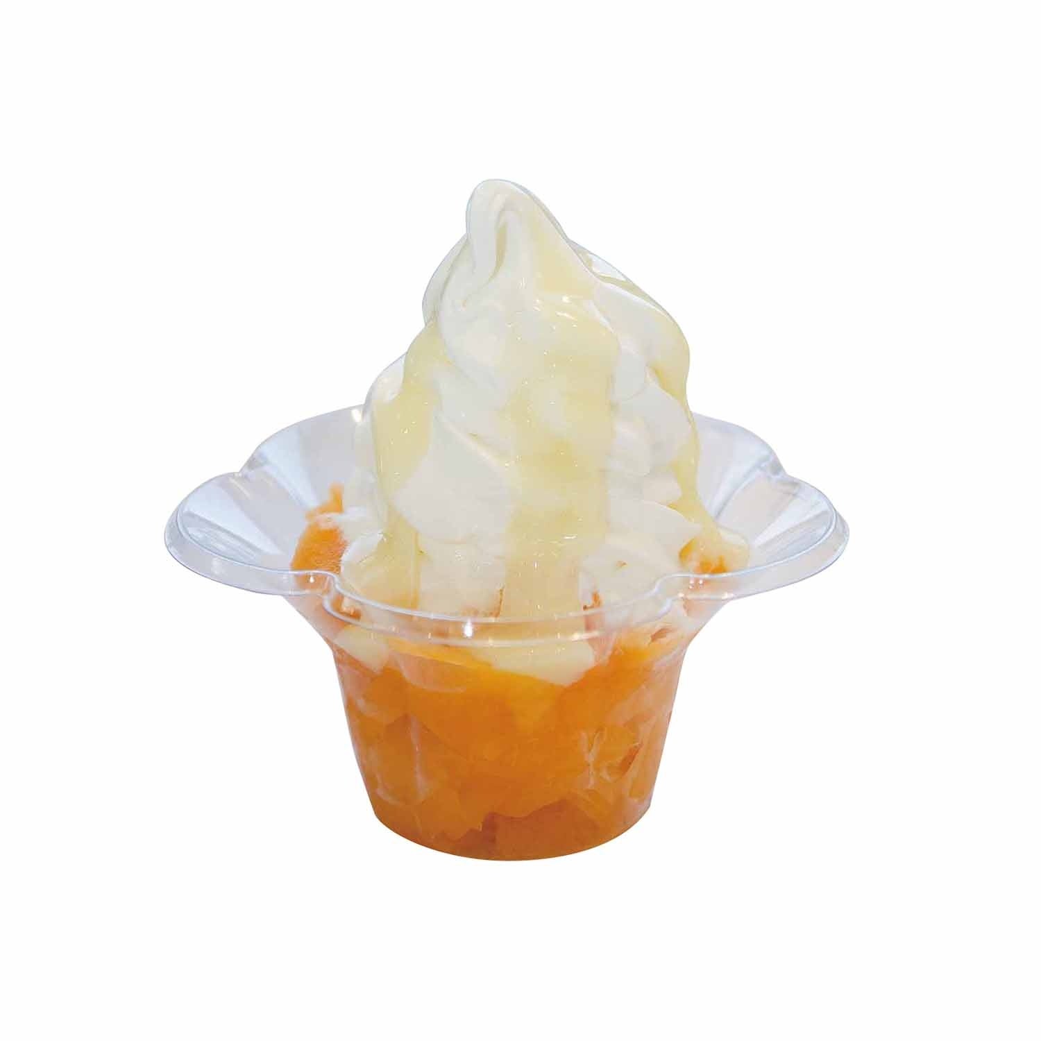 冷凍赤肉夕張メロンを削り、その上にミルクソフトをのせました。