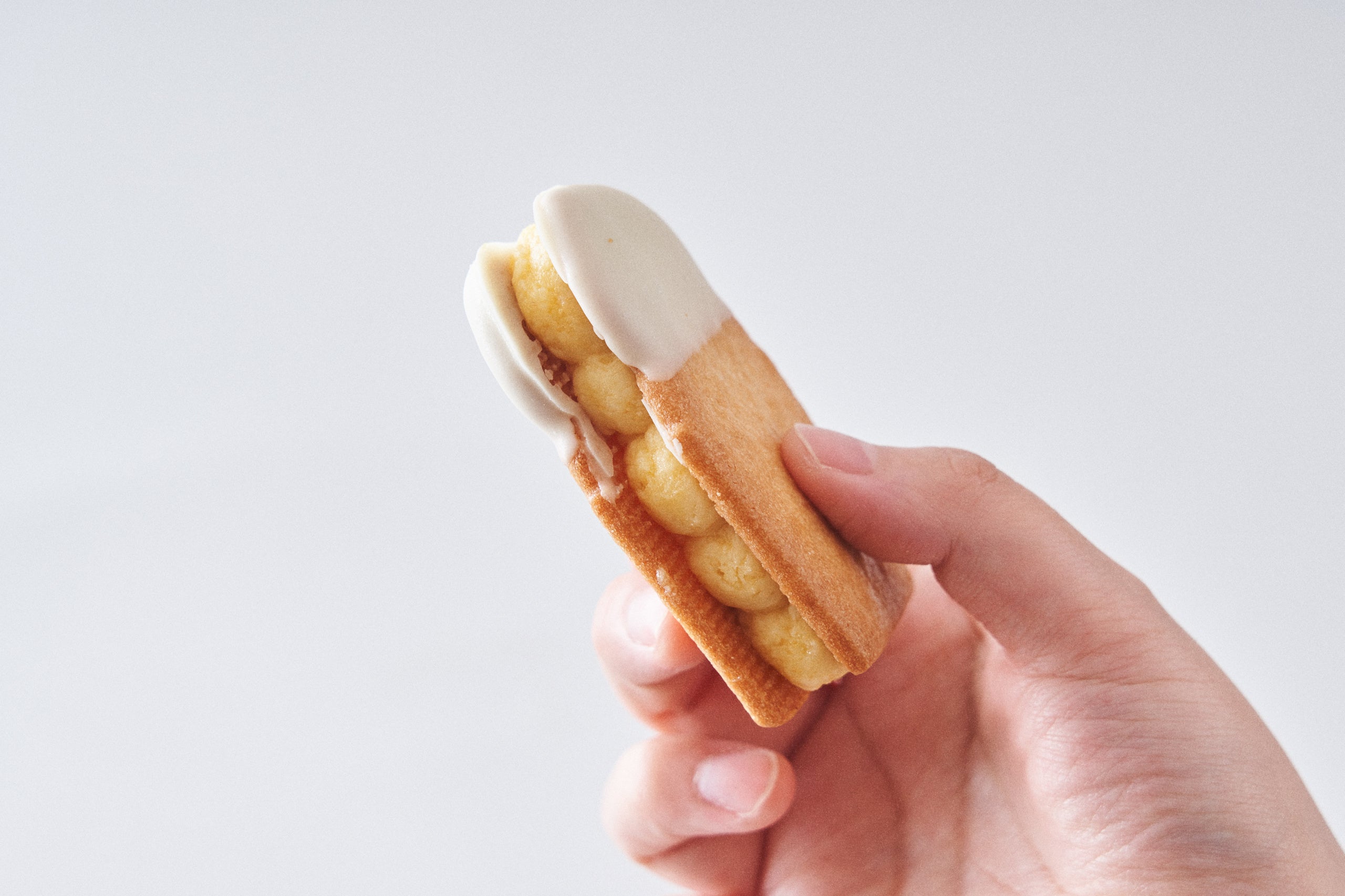 本商品は、生クリーム入りのバタークリームに甘酸っぱい自家製パッションフルーツソースとコク深いホワイトチョコレートで作った“パッションフルーツガナッシュ”を合わせ、ホワイトチョコレートをかけたビスケットで挟みました。スッキリとしたフルーティーな酸味がたっぷりと効いた冷たいクリームが口の中でさっぱりと溶け合い、炎天下の夏を彩るエキゾチックな爽快感が暑い夏にぴったりマッチします。