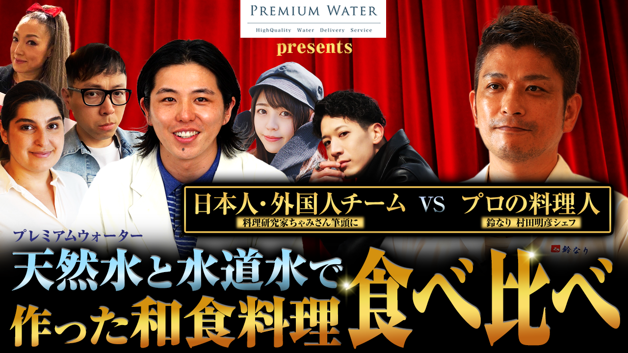 本動画では、日本料理店「鈴なり」の村田 明彦 シェフが、プレミアムウォーターの天然水と水道水で作った、素材は同じ和食料理3種(お吸い物、大根の煮物、サツマイモの炊き込みご飯)を、料理研究家 北原一希(ちゃみ)さんを含めた日本人チーム3名と、フランス・香港・中国出身の外国人チーム3名に食べてもらい、どちらがプレミアムウォーターの天然水で作った料理かを当ててもらう様子を収録しています。