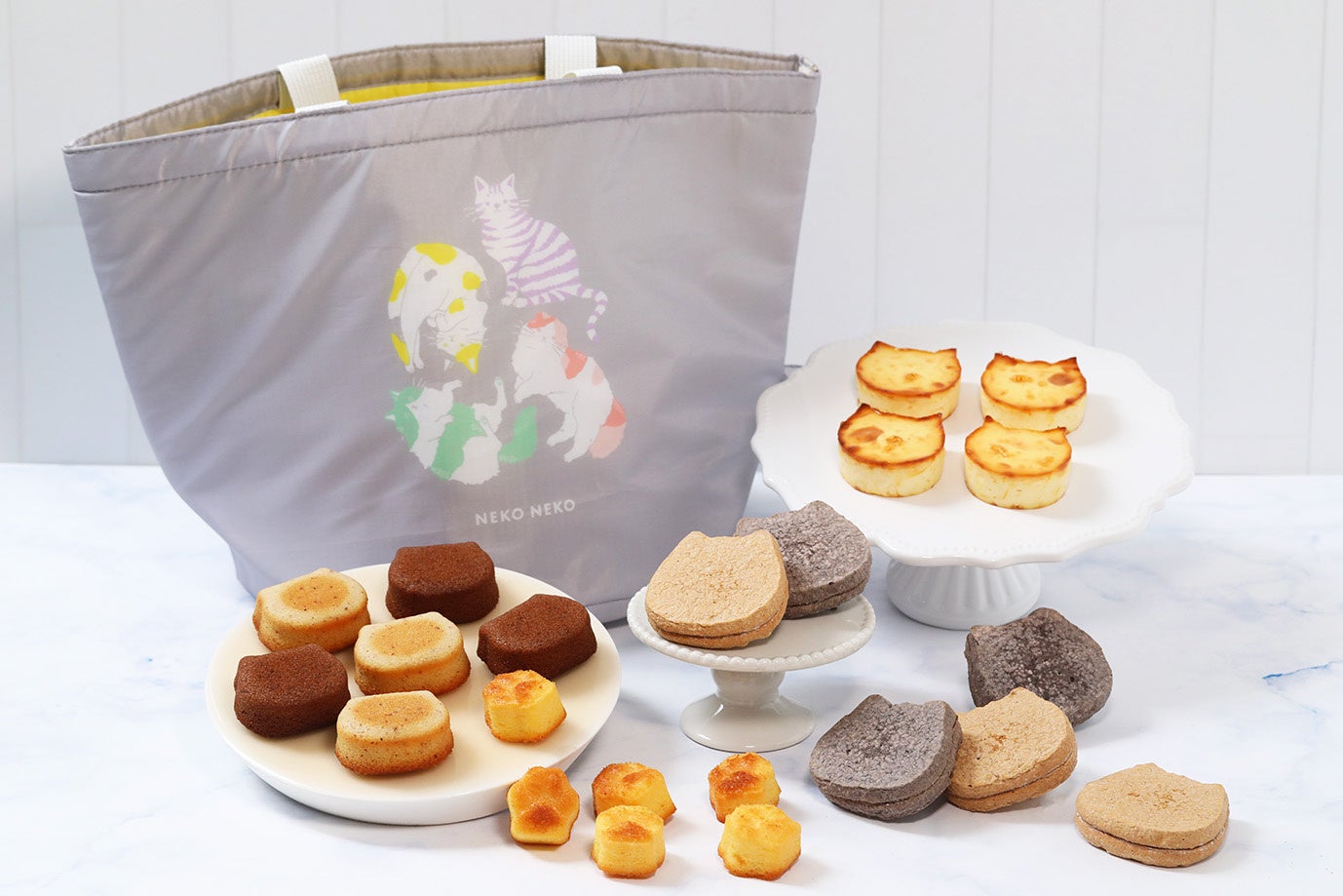 「ねこねこ」の人気商品『にゃんチー4個入』、『ねこねこダックワーズ6個入』、『にくきゅうマドレーヌ』、『ふぃにゃんシェ』(プレーン、ショコラ各3個)を「ねこねこ」オリジナル保冷バックに詰めたお得にお試しいただける7日間限定のセット。