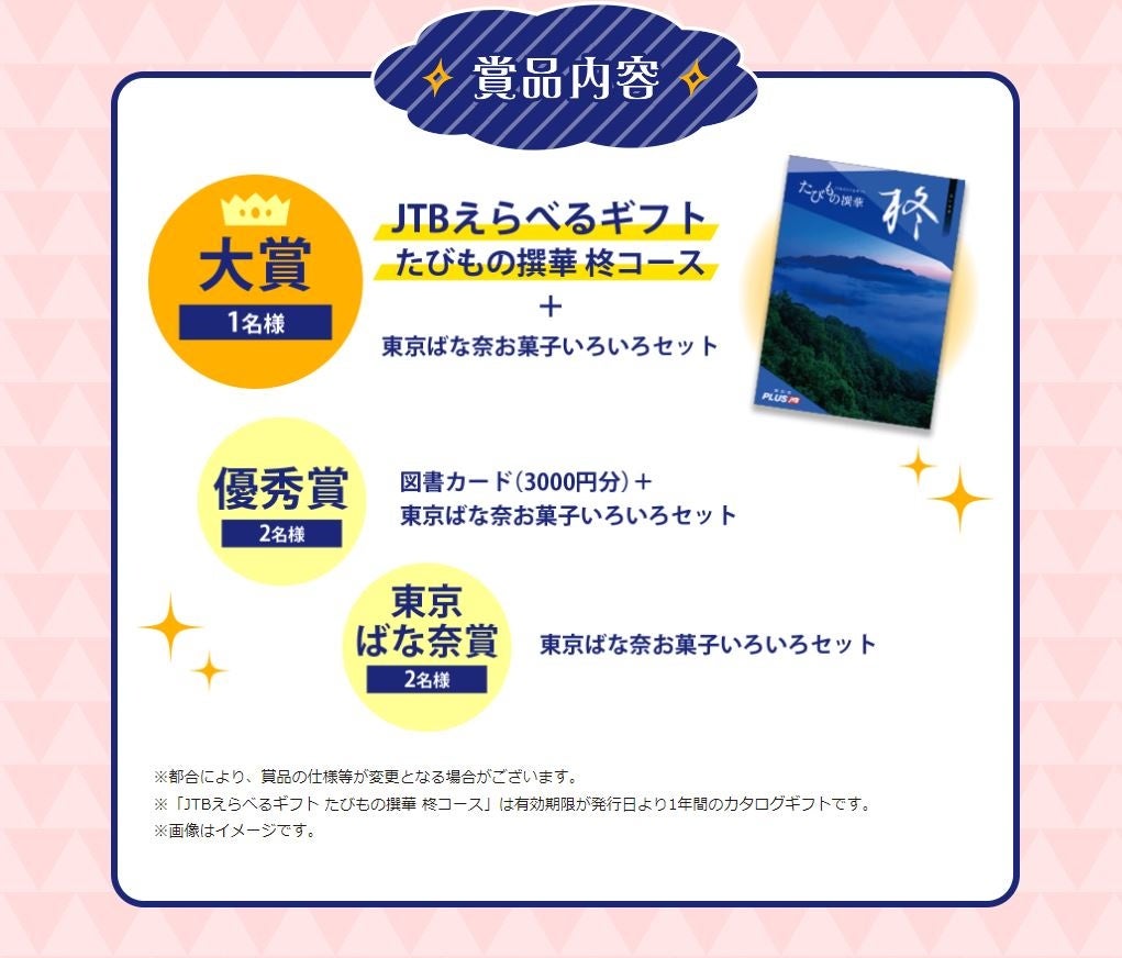 大賞(1名様):「JTBえらべるギフト たびもの撰華 柊コース」、東京ばな奈お菓子いろいろセット
