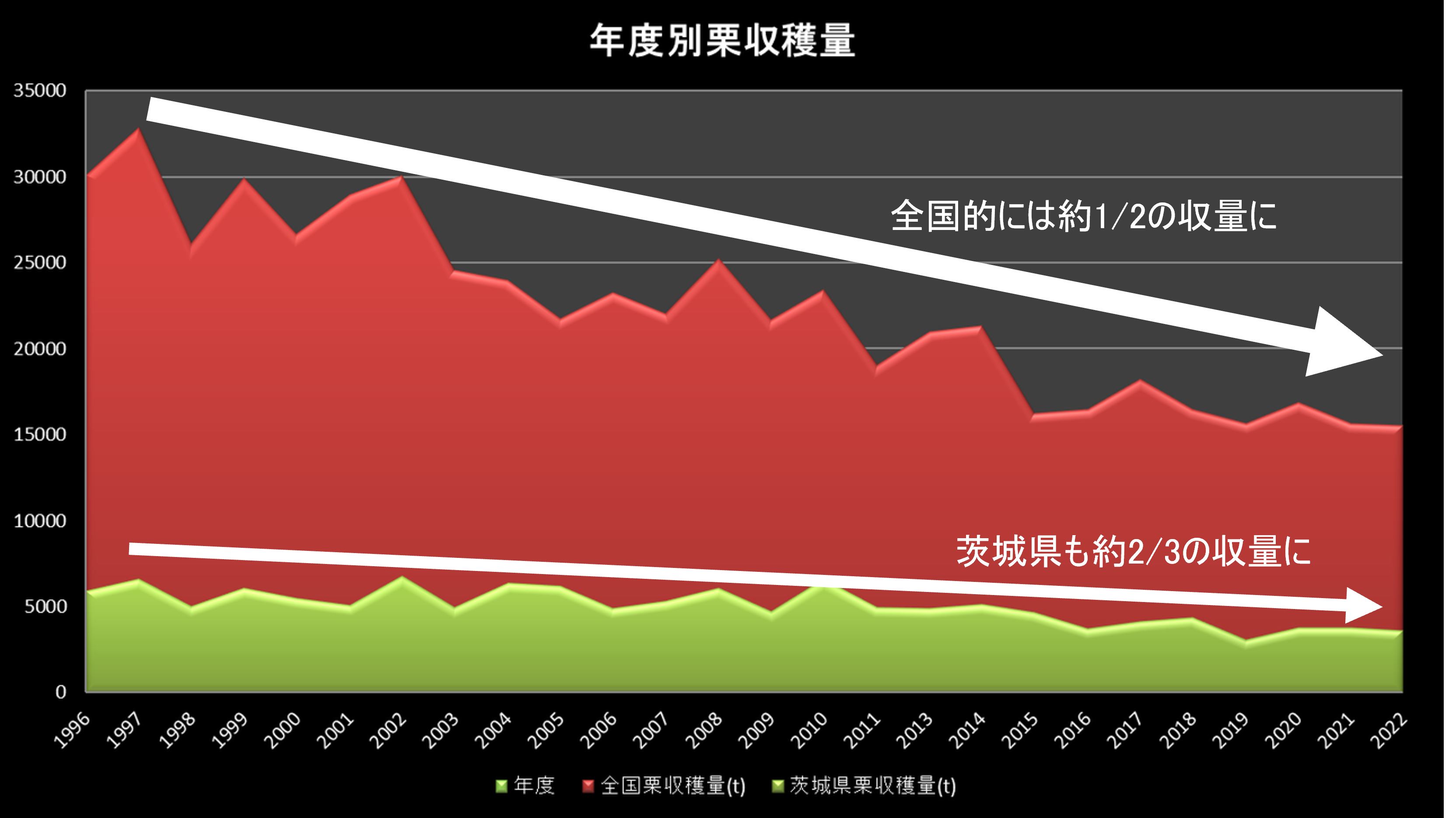 現在、日本における栗の生産量は、生産者の高齢化に伴う休廃業等により年々収穫量は落ち込んでおります。全国的には25年前から約半分、また日本トップの産地である茨城県でも約3分の2に生産量が落ち込んでおり、この傾向は今後も続いていくものと思われます。