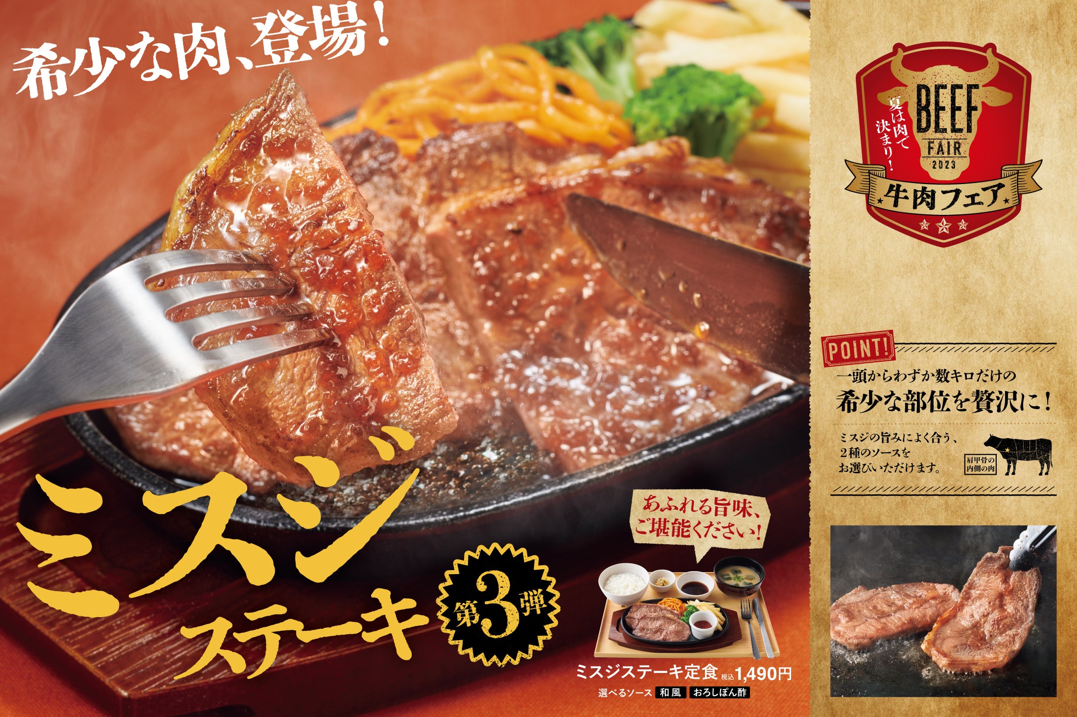 牛肉フェア第三弾は、希少部位“ミスジ”を使った『ミスジステーキ定食【和風ソース/おろしぽん酢】』 1,490円が新登場です。“ミスジ”は、一頭の牛から、わずか数キロしか取れない希少部位で赤身と脂身のバランスが絶妙です。やわらかくも歯ごたえのある食感で、噛めば噛むほど牛肉本来のおいしさを楽しめます。フォークとナイフを使用して食べていただける一品で、より一層贅沢気分を味わえます。