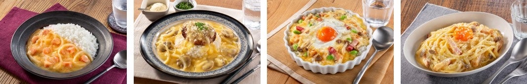 画像左から、「辛い!?カルボシチュー」、「濃厚チーズのハンバーグカルボシチュー」、「【カルボシチューをリメイク】カルボドリア」「【カルボシチューをリメイク】スパゲッティカルボナーラ」