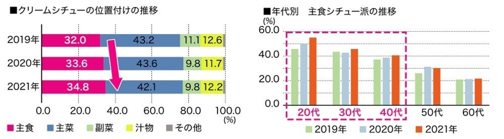お客様調査を行ったところ、シチューをごはんにかけて主食として楽しむ”かけシチュー”を実施する割合が20代~40代を中心として増加傾向にあることが分かりました(※1)。シチューのワンディッシュメニュー化が進んでいることを受け、既存の製品よりもさらに“ごはんにかけたくなる味わい”に特化したシチューも提案していきたいと考えました。