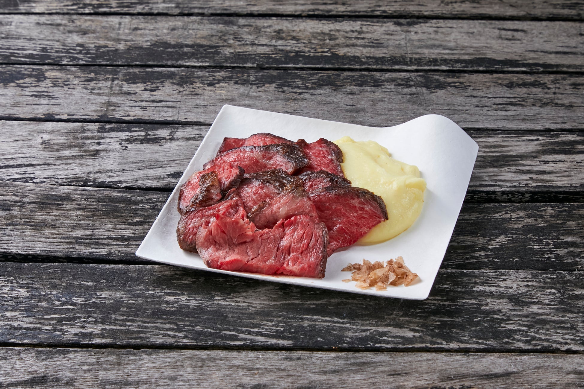 (左から) BBQビーフ ブロシェット、グリルドビーフバーガー、ビーフロティ スモークシーソルト