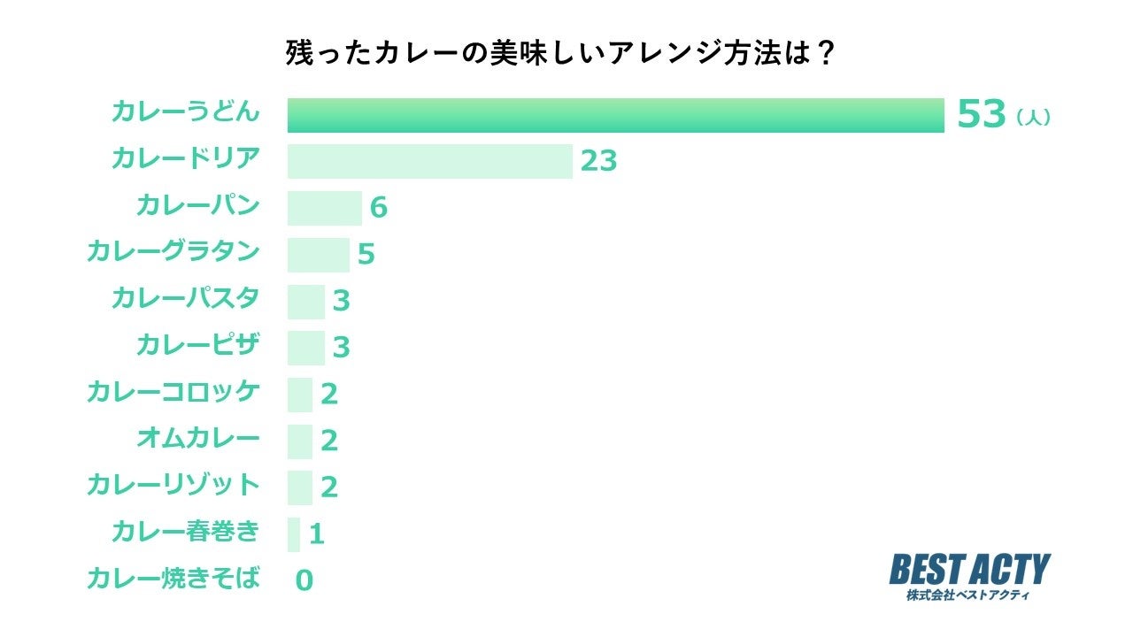 残ったカレーの美味しいアレンジレシピについて100人にアンケートを行ったところ、「カレーうどん」と回答する人が最も多い結果となりました。