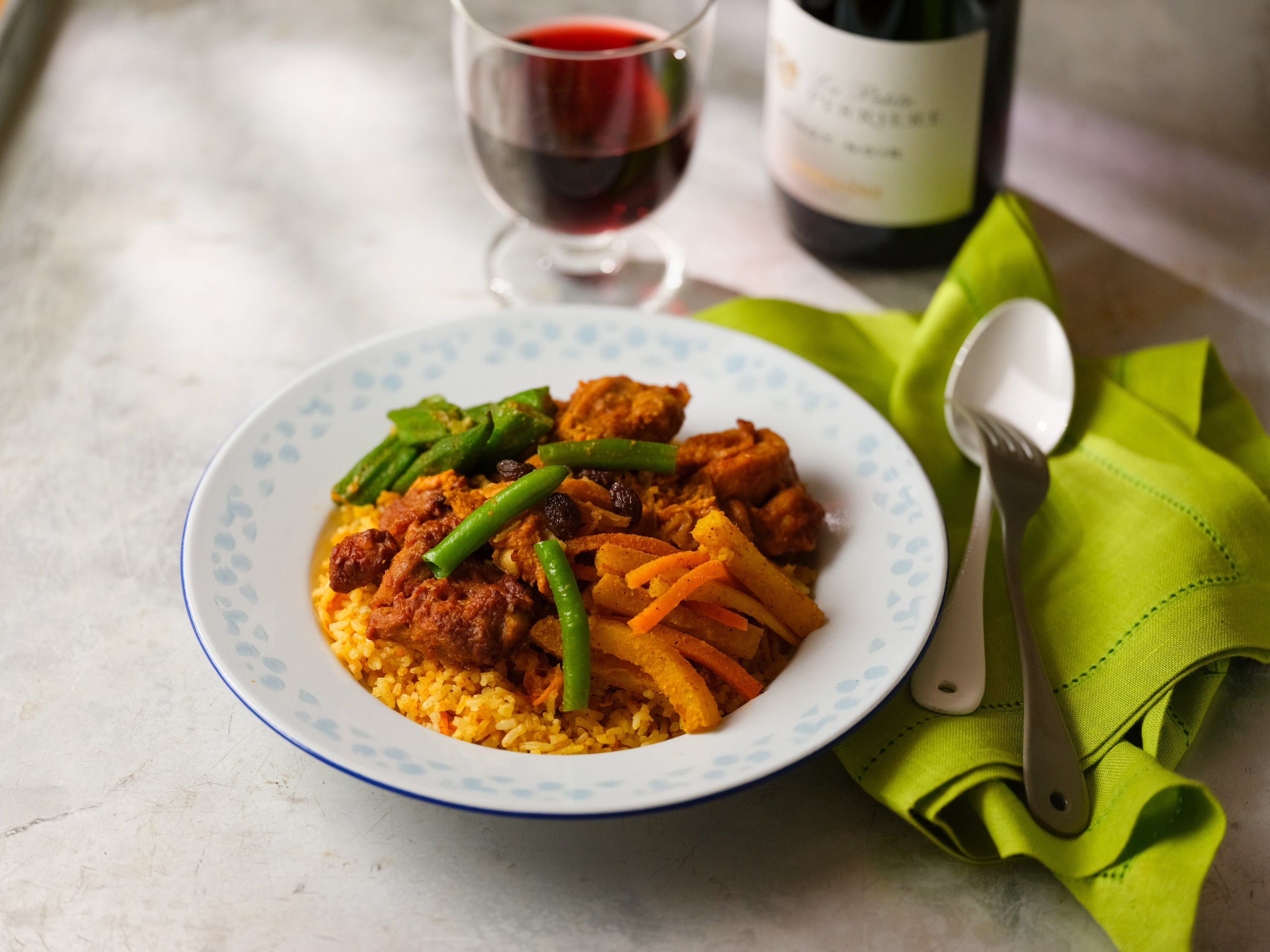 スパイスと甘味のある果実風味が特長のピノノワールをチキンビリヤニとペアリングしました。ビリヤニの辛み、旨みより一層が引き立ちます。