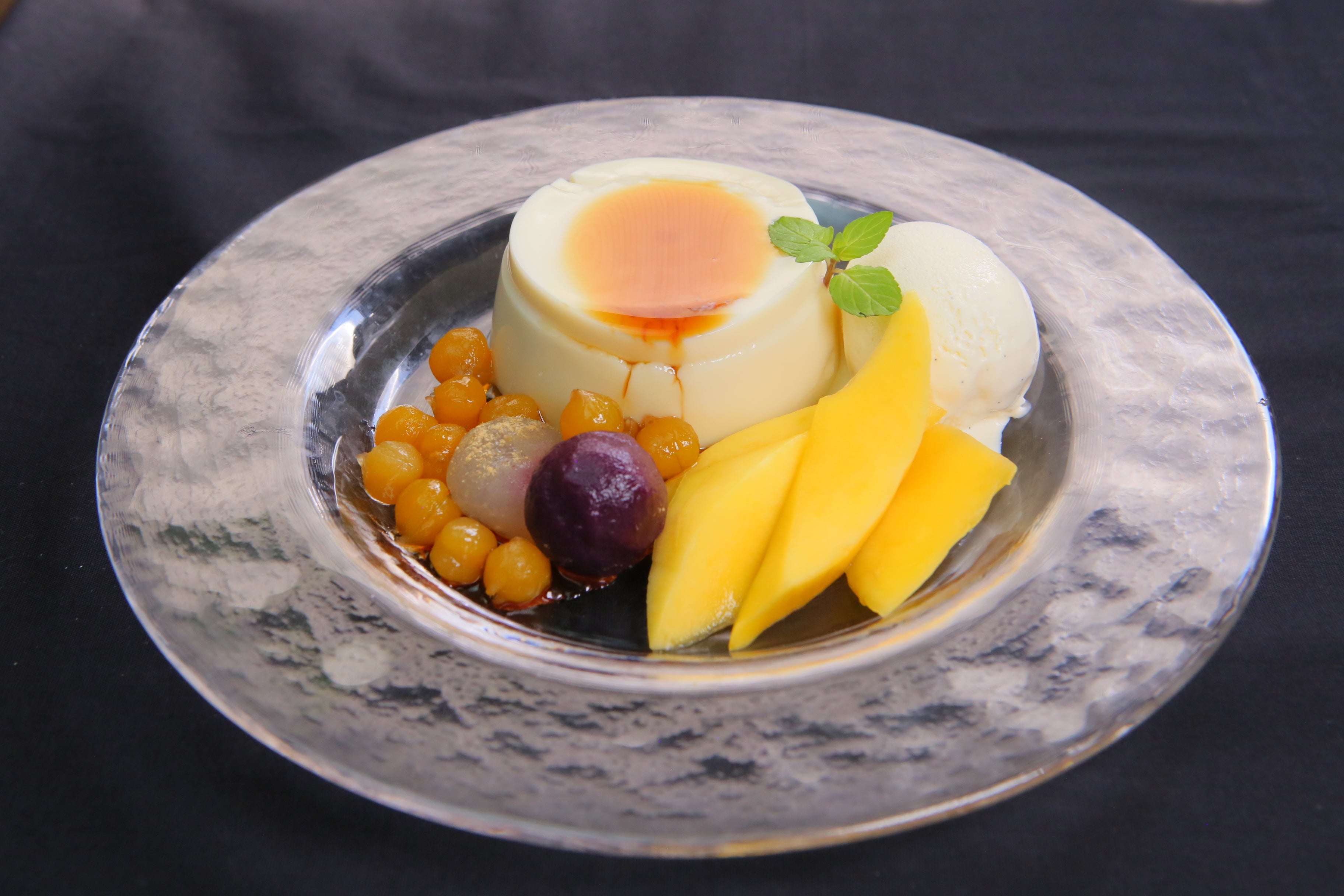 2種もちと黒蜜の豆花 フレッシュマンゴーとバニラジェラート添え