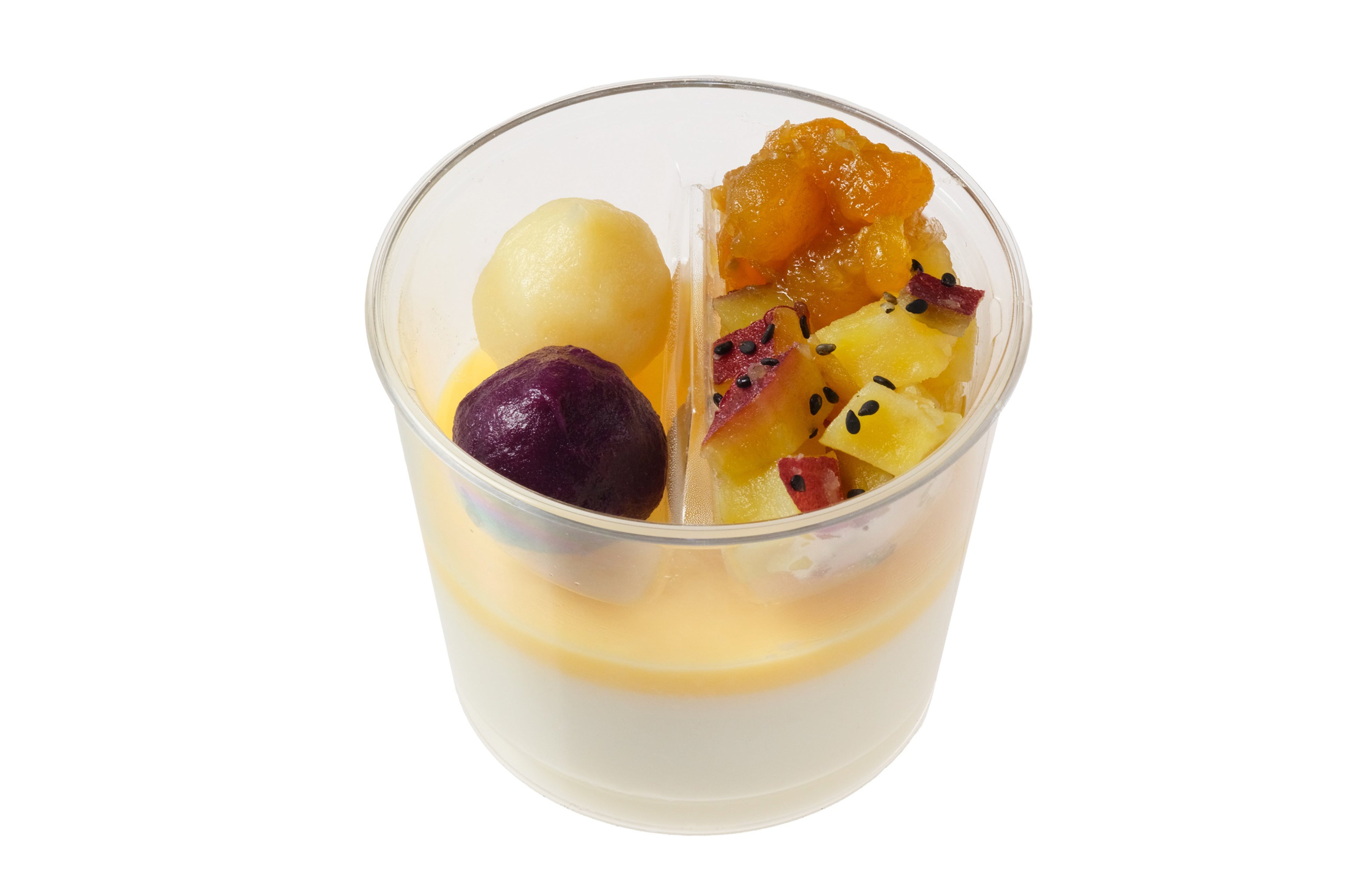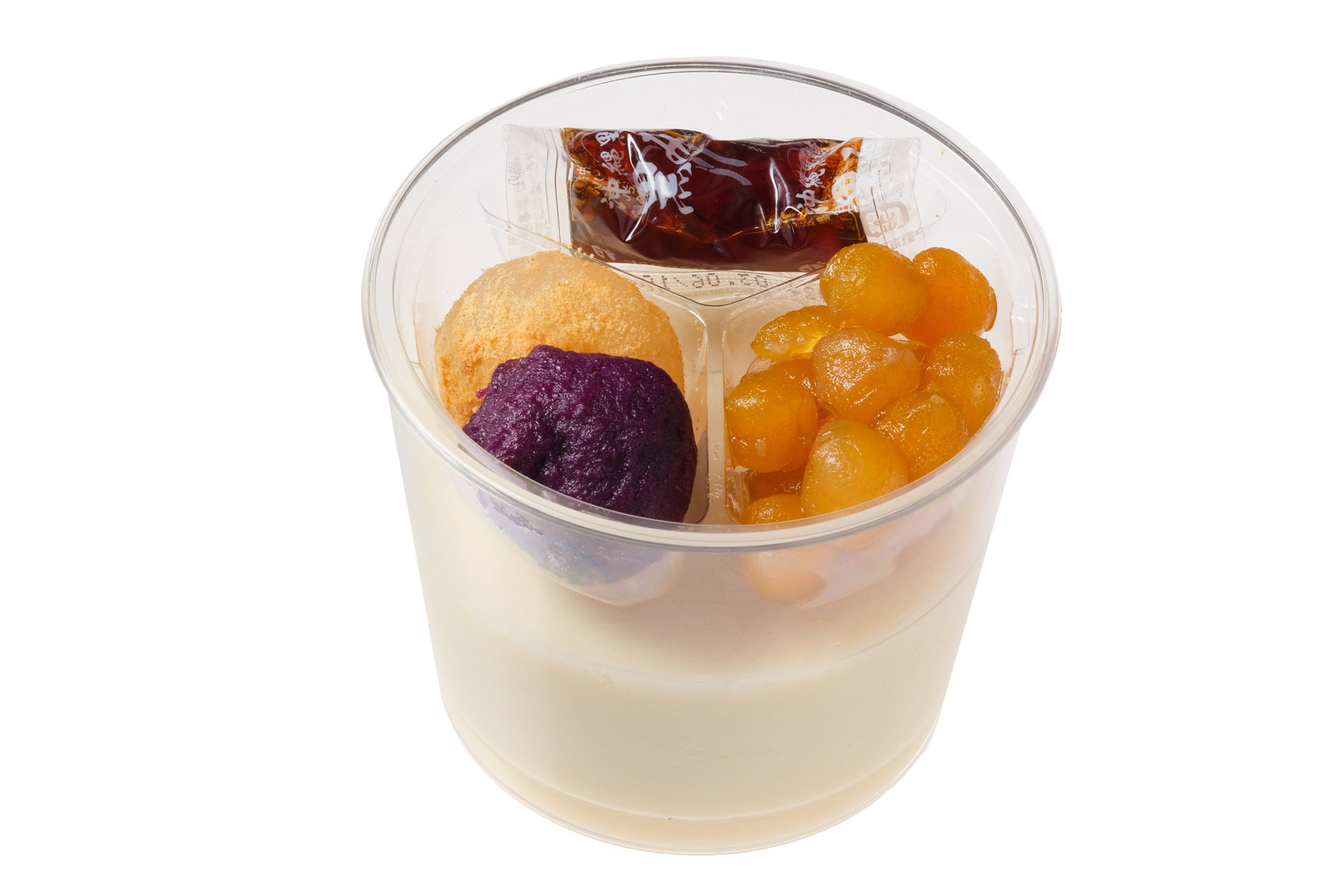 2015年の発売から長年愛されてきたモーモーチャーチャーを、更に本格的なアジアンスイーツにすべくトッピングを変更しリニューアルしました。1つ目は羽二重餅のトッピングを、2色の芋餅に変更しました。お芋の風味を楽しんでいただくために、できるだけ芋の量を増やして蒸しあげたもちもち食感の2色の芋餅で彩りも加えました。2つ目は豆とさつま芋煮を自家製に変更しました。ひよこ豆と、さつま芋を自社工場でふっくらと炊き上げました。トッピングの変更で豆のホックリ感やさつま芋の味わいがしっかりと感じられるようになりました。