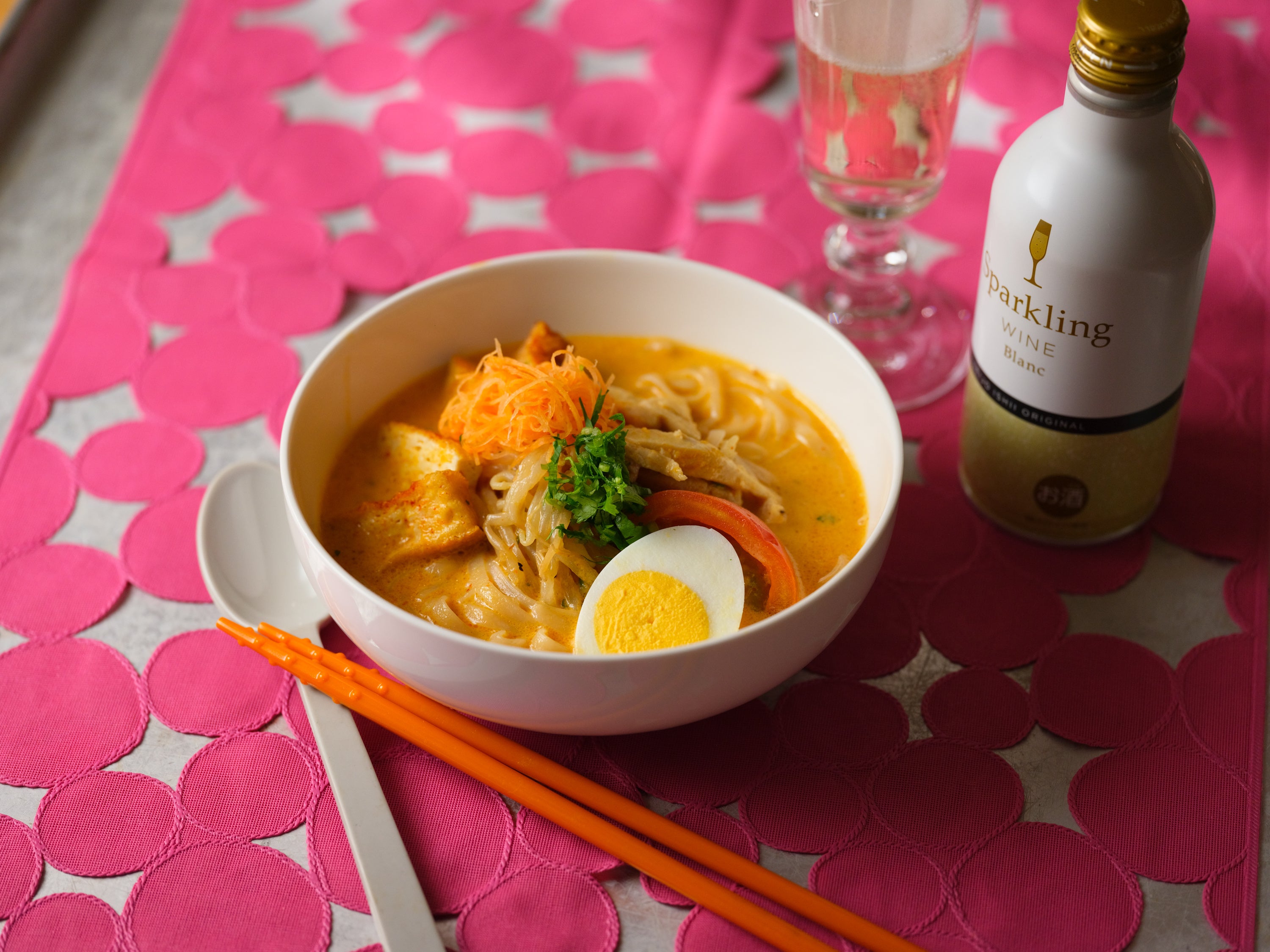 ピリッとした辛さとまろやかさのあるラクサに手軽なスパークリングワインを合わせることで、甘みのあるシャルドネの風味が辛みを中和します。手軽な缶ワインで屋台気分も楽しめます。