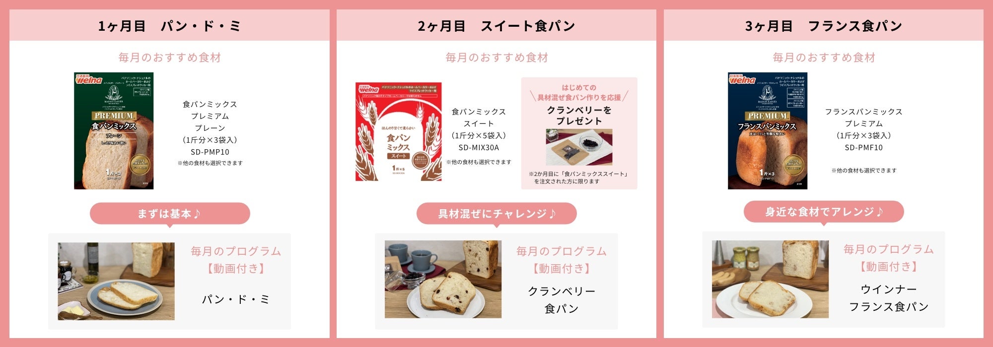 おうちで食パンを焼く楽しさをお伝えするために、基本からアレンジまで3つのレシピを3ヶ月にわたりご紹介します。ホームベーカリーに入れるだけで簡単に食パンを作れるように調合されたパンミックスを使用すれば、計量の心配もなく、すぐにパンづくりに挑戦できます。すべてのレシピには動画がついており、見ながら準備をすれば簡単にパン作りを楽しめます。ホームベーカリーは、3ヶ月間のトライアル期間終了後に、買い取ることも可能。