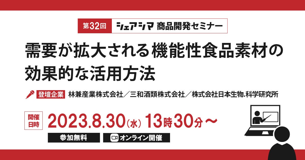 2023年8月30日(水)に開催する第32回セミナーは、「需要が拡大される機能性食品素材の効果的な活用方法」がテーマです。近年、益々需要が拡大されている機能性食品。その中でも原料となる素材に焦点を当て、その効果的な活用方法を各社より説明します。