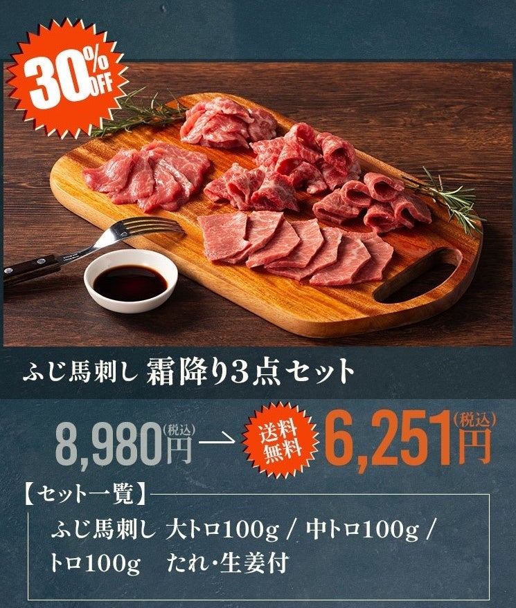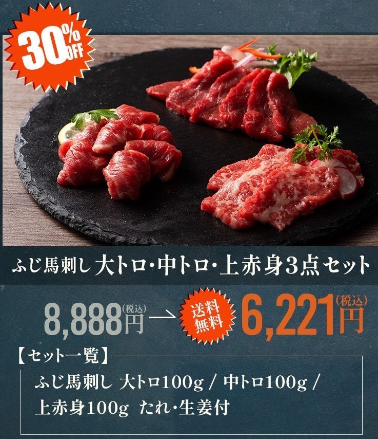 フジチクが誇る大人気部位の「大トロ・中トロ・上赤身」の霜降りから赤身まで堪能できるセットです。フジチクのお肉の良さを馬刺しの日に味わえます!
