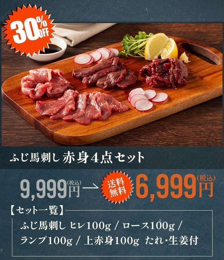 馬刺しの定番「赤身馬刺し」を堪能できるセット。あっさりとしており馬肉本来の旨味を味わえさらにふじ馬刺しの特徴である柔らかく濃厚な味わいが楽しめるセットです。