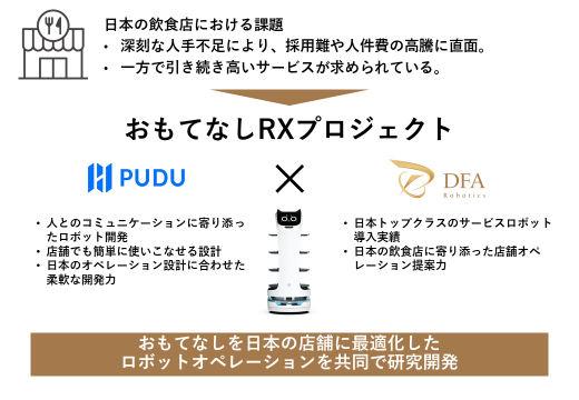 おもてなしRX®プロジェクトは、国内3,250台のロボットを導入し、飲食店の課題を現場で解決してきたDFA Roboticsが、ネコ型配膳ロボット「BellaBot(ベラボット)」の開発等を通し、人とロボットの共存を推進してきたPudu Robotics Japanと共に、国内の飲食店において最適化されたロボットオペレーションを研究開発するプロジェクトです。