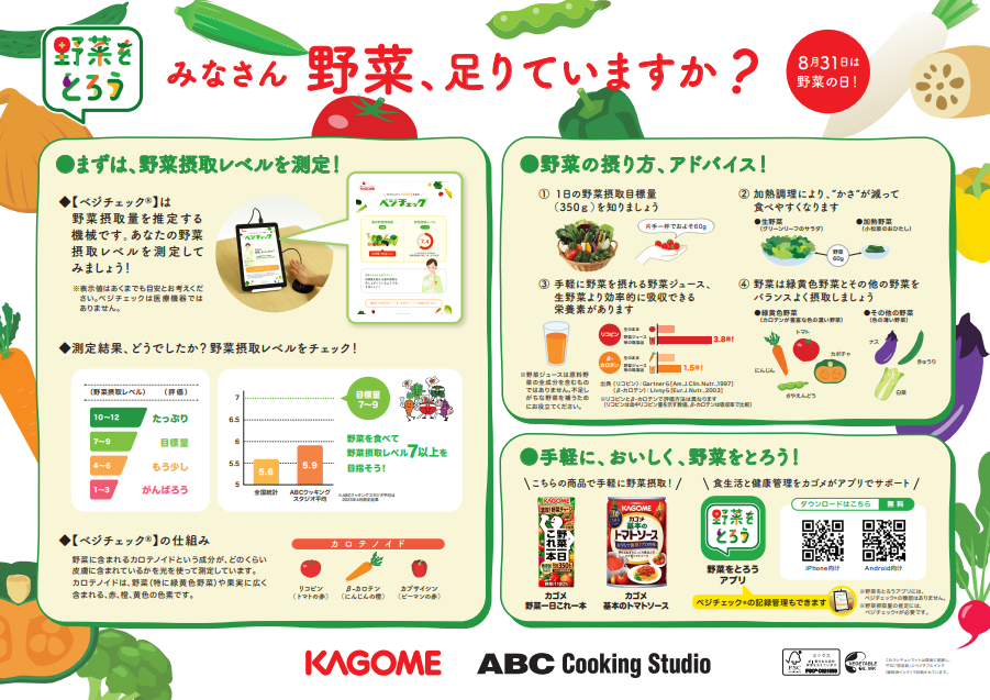 今回の取り組みは、カゴメが 2020 年 1月から始めた野菜摂取推進活動「野菜をとろうキャンペーン」の重要施策『企業・団体との野菜摂取推進プロジェクト』の一環であり、ABCはこのキャンペーンに賛同しています。2022年11月にリニューアルしたABCの料理基礎クラスでは「12メニューすべてのレッスンで1日に必要な野菜の半分(175g)※1が摂れる」をコンセプトに全国でレッスンをしてきました。2023年4月からはカゴメとタイアップ企画として、カゴメが提供する野菜摂取量推定機「ベジチェック®」を導入し、料理基礎クラスの受講生を中心に野菜摂取レベルの測定を実施しています。両社は「ベジチェック®」での測定を通じて、より一層野菜摂取の自覚と理解を高め、食生活を見直すきっかけ作りを行いたいと考えています。そして、2023年8月1日からはさらに料理バリエーションクラス(Aメニュー)とタイアップし、より多くの方に野菜のおいしい食べ方を発信してまいります。