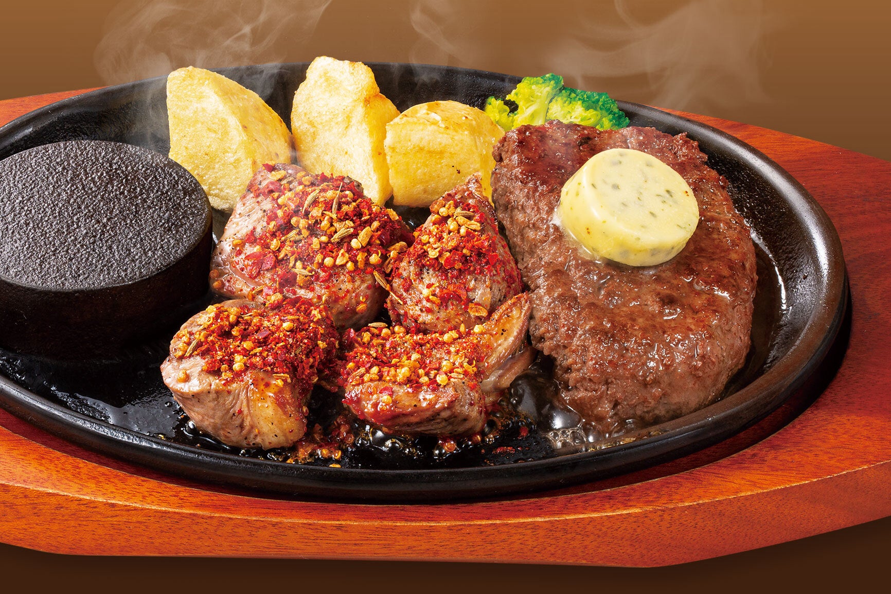 「やみつきラムステーキ」と牛タンの素材の弾力とうま味が豊かな、コリコリ、ジューシーな新食感を楽しめる「牛タン100%ハンバーグ」の両方が楽しめる、ランチ限定のコンビメニューです。おかわり自由のライス・パン、スープバー付で価格は1,390円(税込1,529円)。