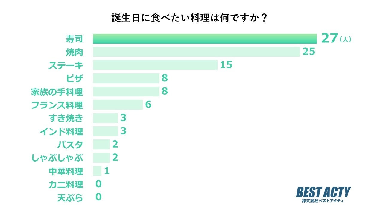 誕生日に食べたい料理について100人にアンケートを行ったところ、「寿司」と回答する人が最も多い結果となりました。