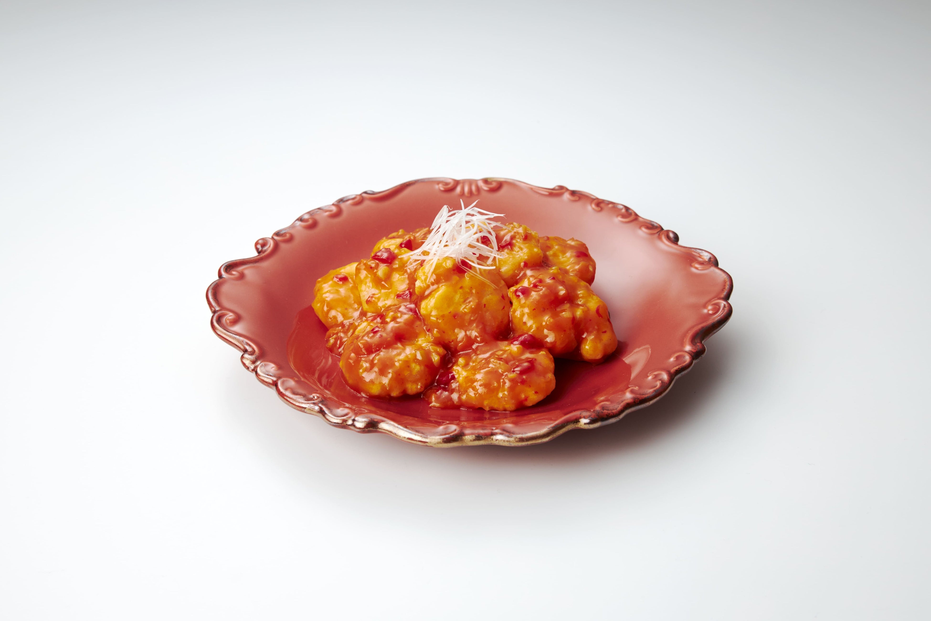 海⽼チリソースの主役である海老を引き立たせるために「衣」にこだわりました。衣が厚いと海老の食感が分かりづらくなってしまいますが、一方で衣が無いと海老とソースの一体感が感じられません。海老のぷりぷりっとしたベストな食感を生み出すため、粉専門メーカーと協力して何度も試作を繰り返し、薄付きながらも海老から離れない新しい衣をこの海老チリソースのために開発しました。購入されたお客様からも「海老がぷりぷり」「海老が美味しい」と好評のお声をいただいております。