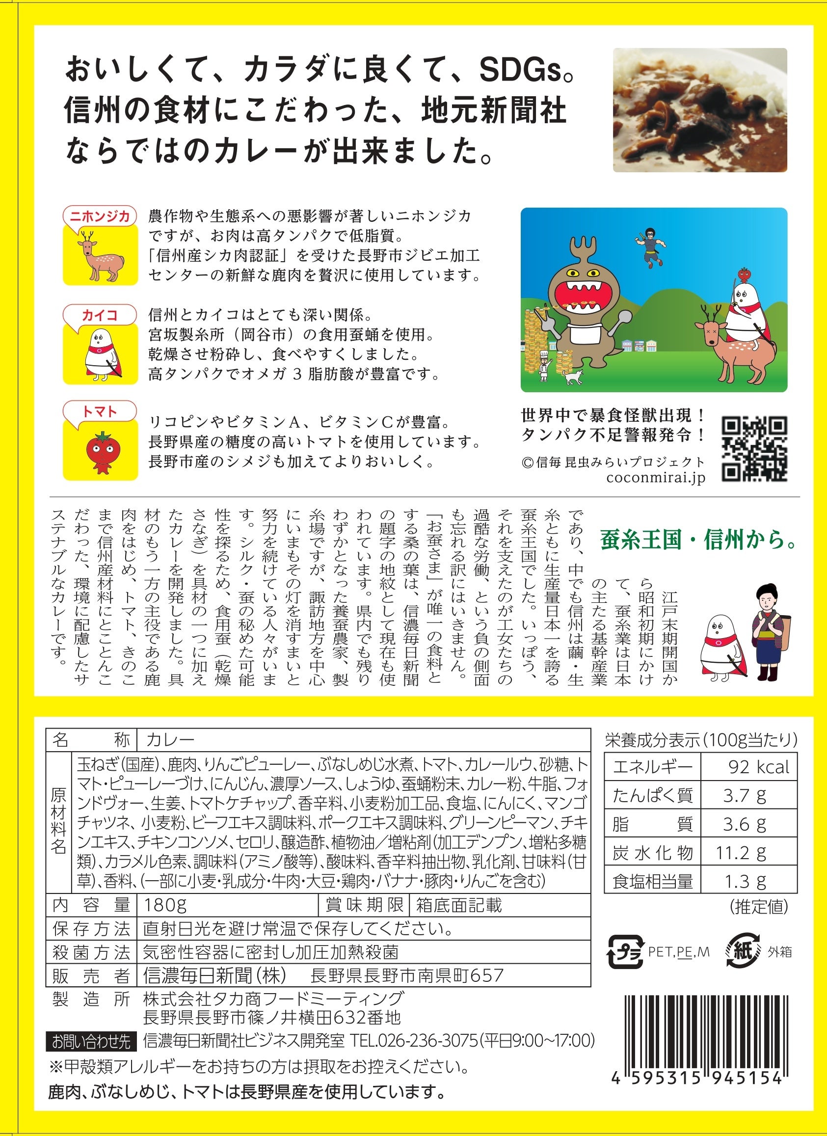 信州産シカ肉認証を受けた長野市ジビエ加工センターの新鮮な鹿肉、岡谷蚕糸博物館に併設の宮坂製糸所の食用蚕蛹を使用。鹿肉は高タンパク低脂質でヘルシー、アスリート志向の方にもおすすめです。新鮮な鹿肉は臭みもなく噛むほどに旨みが口中に広がります。またカイコも鹿肉同様に高タンパクでオメガ3脂肪酸も豊富と栄養価が高い食材。サクサクするまで乾燥させた後粉砕し、食べやすくしました。県内産の糖度の高いトマトや、長野市産の良質なシメジも加えてよりおいしく、ちょっぴりスパイシーに仕上げています。