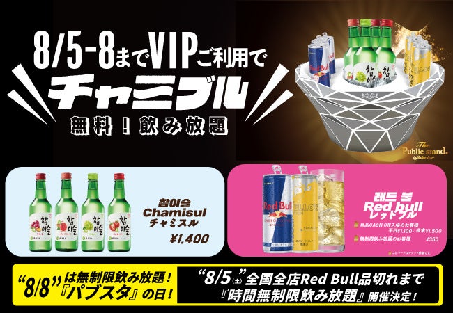 VIPシートご利用のお客様は「チャミスル」「レッドブル」「チャミブル」が好きなだけ飲み放題。