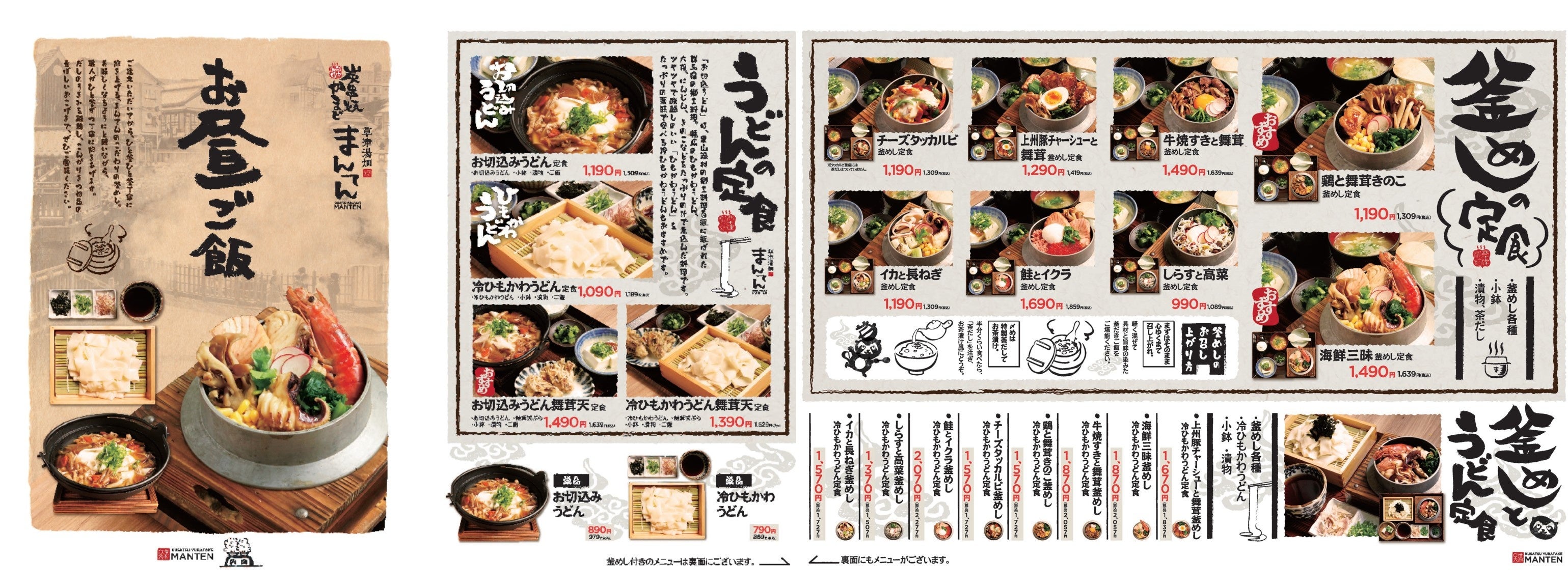 『草津湯畑 まんてん』 では、群馬名物の釜めし、お切込み・ひもかわうどんをはじめ、上州牛・上州豚、舞茸や地元の野菜、群馬名産のこんにゃく、名物焼き饅頭など、様々な地元(群馬)グルメをご堪能いただけます。中でも 「まんてん」 自慢の “釜めし” は、全てご注文いただいてからひとつひとつ丁寧に炊き上げてご提供する本格釜めし。様々な食材を盛り込んだ定番釜めしのほか、上州牛や舞茸など地元食材をふんだんに使った釜めし、群馬名物をより幅広い方々に楽しんいただけるようオリジナルでアレンジを加えた海鮮やタッカルビ釜めしなど、豊富な種類を取り揃えております。釜めしの他にも「まんてん」ならではの手間ひまかけた自慢の炭焼(串&炉端) 、うどん、一品料理など、お食事だけではなく、お酒にも合うバリエーション豊富なメニューをご用意しておりますので、ランチ・ディナーと様々なシーンで気軽にご利用、お楽しみください。