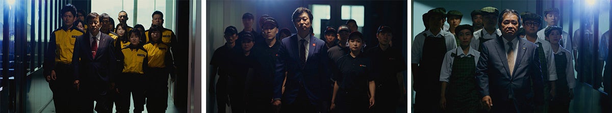 3社長が社員を引き連れ、真剣な面持ちで廊下に集結。