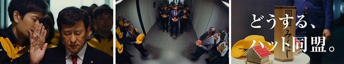 「ハット首脳会談2023」では、各社社員も制服を着て登場し、昨年同様、社名の“ハットの意味”を各社が説明。1社だけ意味が違うイエローハット堀江社長の顔が曇り、張り詰めた雰囲気が漂います。そんな中、突如登場する「同盟みくじ」。「ハット同盟」を結成するか否かを、運任せにおみくじで決めてみることに。そして、「結成しない」が出たため、堀江社長は今年の同盟を諦めかけますが、中村社長、福原社長が手を差し出し、「それでも、ハット同盟結成。」と全員で手を重ね一言。最後に3社長と社員が集結し、「ハット同盟」を記念して制作された、3社の社長のイラストが描かれた「ハット3社長Tシャツ」が登場。今年もハット同盟は無事に結成となりました。