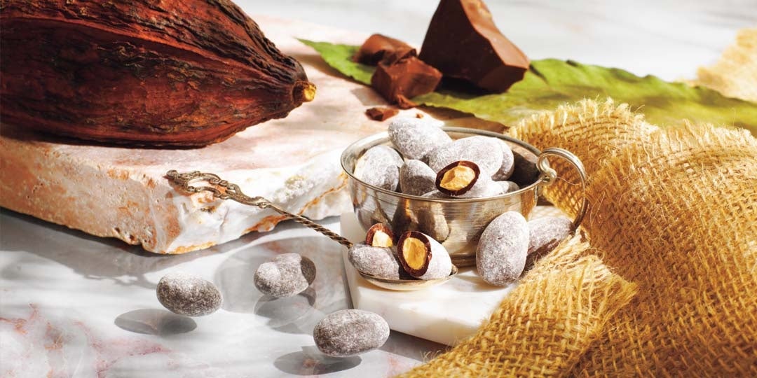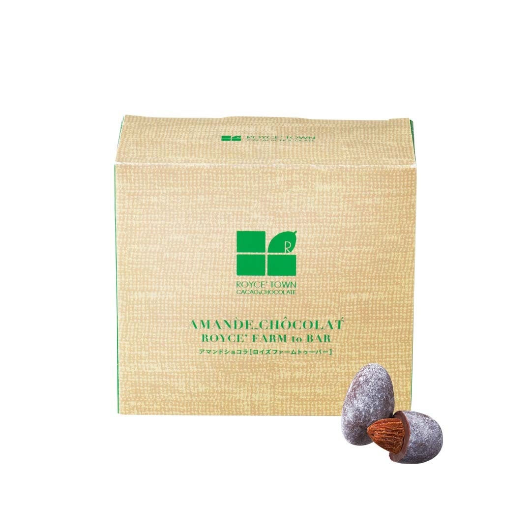 フルーティで酸味のあるロイズファームトゥーバーのチョコレートで、カリッとした香ばしいアーモンドを丸ごとひと粒コーティングしました。表面にまぶした粉糖のやさしい甘さ、チョコレートのビターな味わいとアーモンドの香ばしさが調和します。
