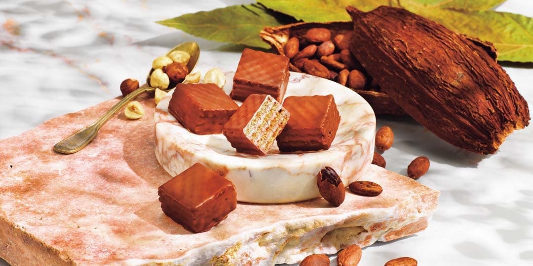 さくさくとした食感のウエハースでヘーゼルナッツクリームをサンドし、ロイズファームトゥーバーのチョコレートでコーティング。コーティングしたミルクチョコレートはカカオの味わいのフルーティな風味やしっかりとしたカカオ感も感じられ、ナッツの味わいやウエハースの香ばしさをすっきりとまとめています。