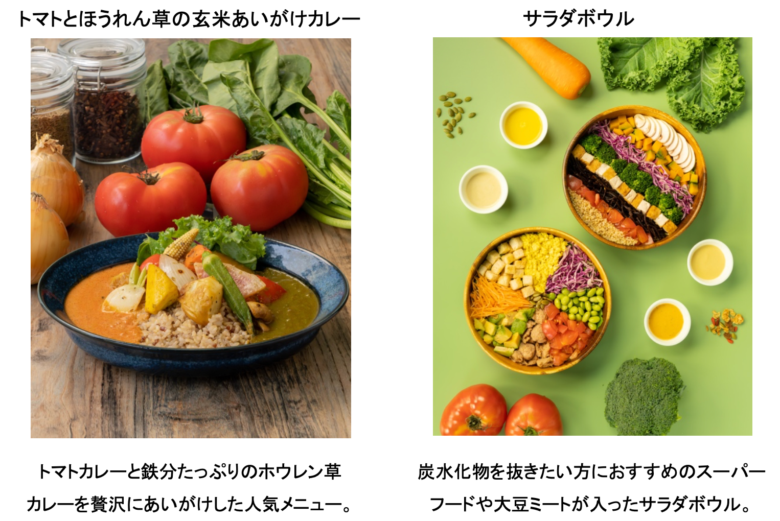 動物性食材や卵、乳製品などを使わずに、100%プラントベースのオールヴィーガンに対応した食事を提供しております。カレーはグルテンフリーで、サラダボウルはオリエンタルヴィーガン(※1)にも対応可能です。食後にはギルトフリーなプラントベースアイスもご用意しておりますが、全てにおいて化学調味料、上白糖、乳製品は使用しておらず健康的です。
