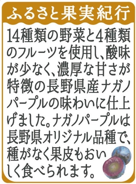 「野菜生活100 濃厚果実 信州ナガノパープルミックス」は、酸味が少なく、濃厚な甘さが特徴の長野県産ナガノパープルの味わいに仕上げた野菜&果実100%ミックスジュースです。ナガノパープルは長野県オリジナル品種で、種がなく果皮もおいしく食べられる品種です。おやつ・デザートタイムやリラックスシーンにおすすめです。