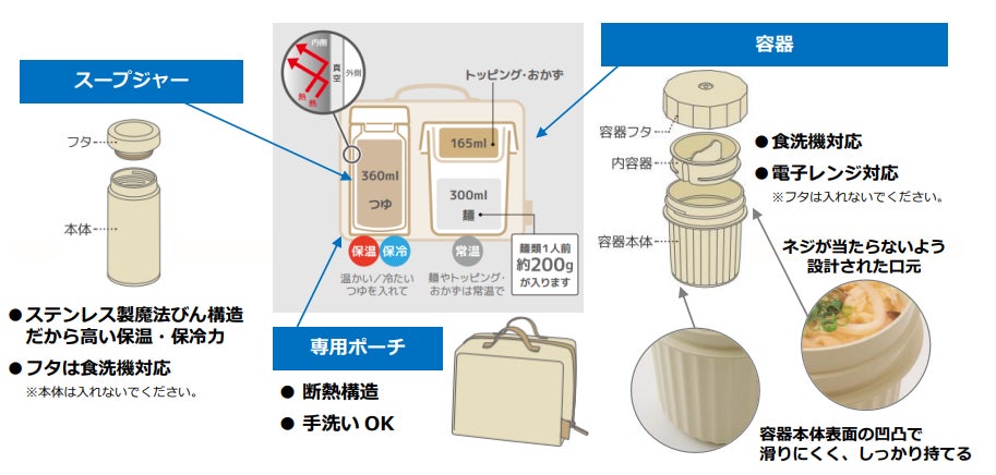 本製品は、保温・保冷ができる360mlのスープジャーと、常温で1人前の麺約200gを持ち運ぶ容器本体、トッピングやおかずを入れる内容器、断熱構造のポーチがセットになったお弁当箱です。通常のスープジャーよりも口径を狭くすることで、つゆの温度を高く保ち、麺とつゆを合わせた時にも温かくおいしく感じられる温度を実現。容器本体表面の凹凸は、滑りにくくしっかり持てるように設計しました。また、食べる時の口当たりにもこだわり、麺を入れる容器本体の口元にネジが当たらない形状にしています。