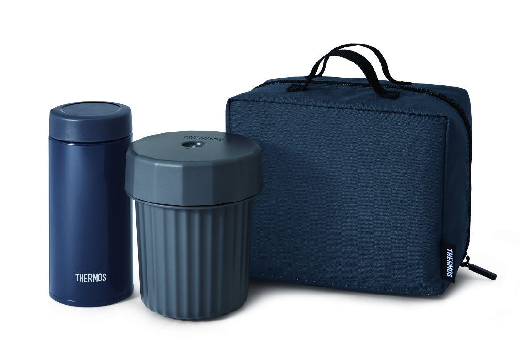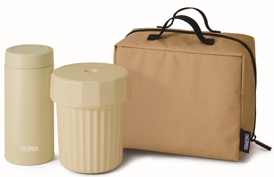 『サーモス ヌードルコンテナー(JEC-1000)』は、スープジャーと約200gの麺類が入る容器本体、トッピングやおかずを入れられる内容器を断熱構造の専用ポーチに入れて持ち運べる弁当箱です。食べる直前にスープジャーに入れたつゆを麺にかけることで、外で温かい麺も冷たい麺もおいしくお楽しみいただけます。