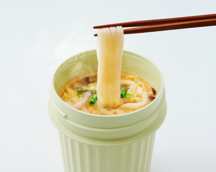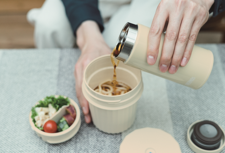 麺はスープと一緒にして持ち運ぶとふやけて食感が悪くなるため、麺とつゆで容器を分けて持ち運び、食べる直前にスープジャーに入れた温かいつゆを麺にかけて食べる方法を採用しました。しかし、現行品のスープジャーでは温かいつゆと常温の麺を混ぜると温度が下がってしまう事が課題としてありました。そこで「そと麺」に適した、より熱が逃げにくい形状のスープジャーを検討。保温力を高めたことで、お弁当でも温かい麺が食べられる仕様になっています。